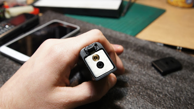 Aby zdjąć stopkę magazynka, należy wcisnąć trzpień będący jednocześnie podstawą sprężyny podajnika kulek ( w modelach innych replik często mamy dostęp do śruby bez konieczności zdejmowania stopki). To umożliwi nam zsunięcie całej stopki i dostęp do śruby trzymającej podstawę zaworu ładowania. Widoczną śrubę (Fot.4) wystarczy zwyczajnie dokręcić, aby doszczelnić całą stopkę.
