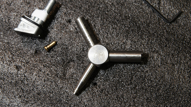 W tym przypadku również musimy zdjąć stopkę magazynka (Fot. 3 i 4). Aby odkręcić zawór możemy użyć odpowiednio szerokiego, płaskiego śrubokręta, lub najlepiej zaopatrzyć się w specjalny klucz do zaworów (Fot.7).