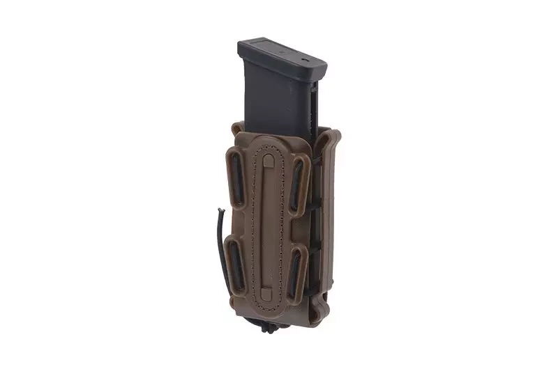 A fast type pouch made of special, durable but elastic polymer capable of holding a single 9 mm pistol magazine. The pouch features a special elastic cord for the adjustment of the “opening” of the pouch that better adjusts the pouch to the contents and prevents magazines from falling out. The pouch can be attached to a belt with a maximum width of 45 mm and to any MOLLE-compatible piece of equipment.