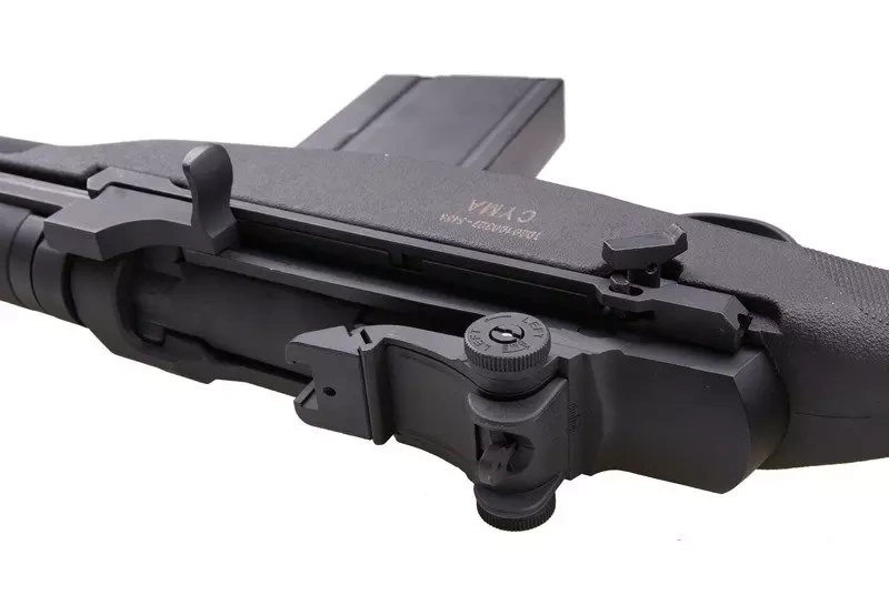 The replica’s body is equipped with a nice texture of the material that is nice in touch and in grooves thanks to which we gain a secure grip even when our palms are dirty or wet. The iron aiming sights consists of an open, well visible front sights and an rear sight that is adjustable both, horizontally and vertically. The CM032 replica has got a metal bolt carrier which reload sound can be a pleasant surprise for every airsoft player.