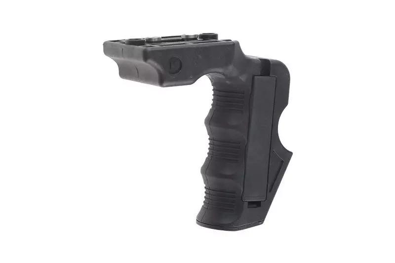 A tactical forward grip made of durable polymer. Attachable to a KEYMOD mounting rail. The sides feature attachment points for a gel button of a flashlight or a laser sight.