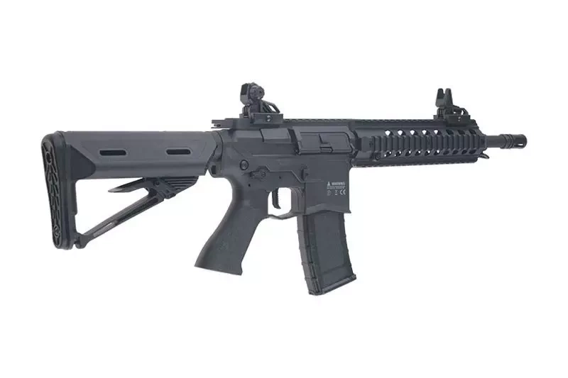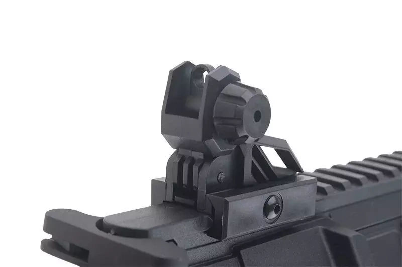 The replica was made mainly from durable polymer. The receiver of the replica has an interesting, modern shape and features manufacturer markings. The ergonomic handguard of the replica was made in RIS mounting system. The implementation of a comfortable, foldable stock, as well as a profiled pistol grip, increases the ergonomics of use.