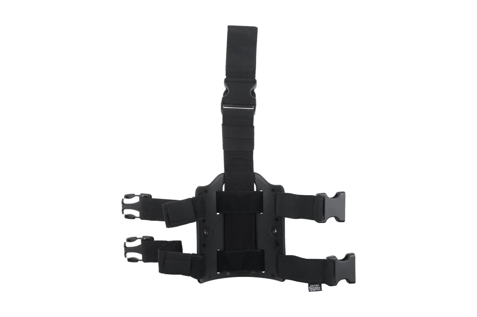 A compact drop-leg panel made of polymer and nylon by Primal Gear. The panel features 3 mounting sockets intended for the attachment of holsters and additional pouches. A socket enables the facing angle adjustment of a holster / pouch.
