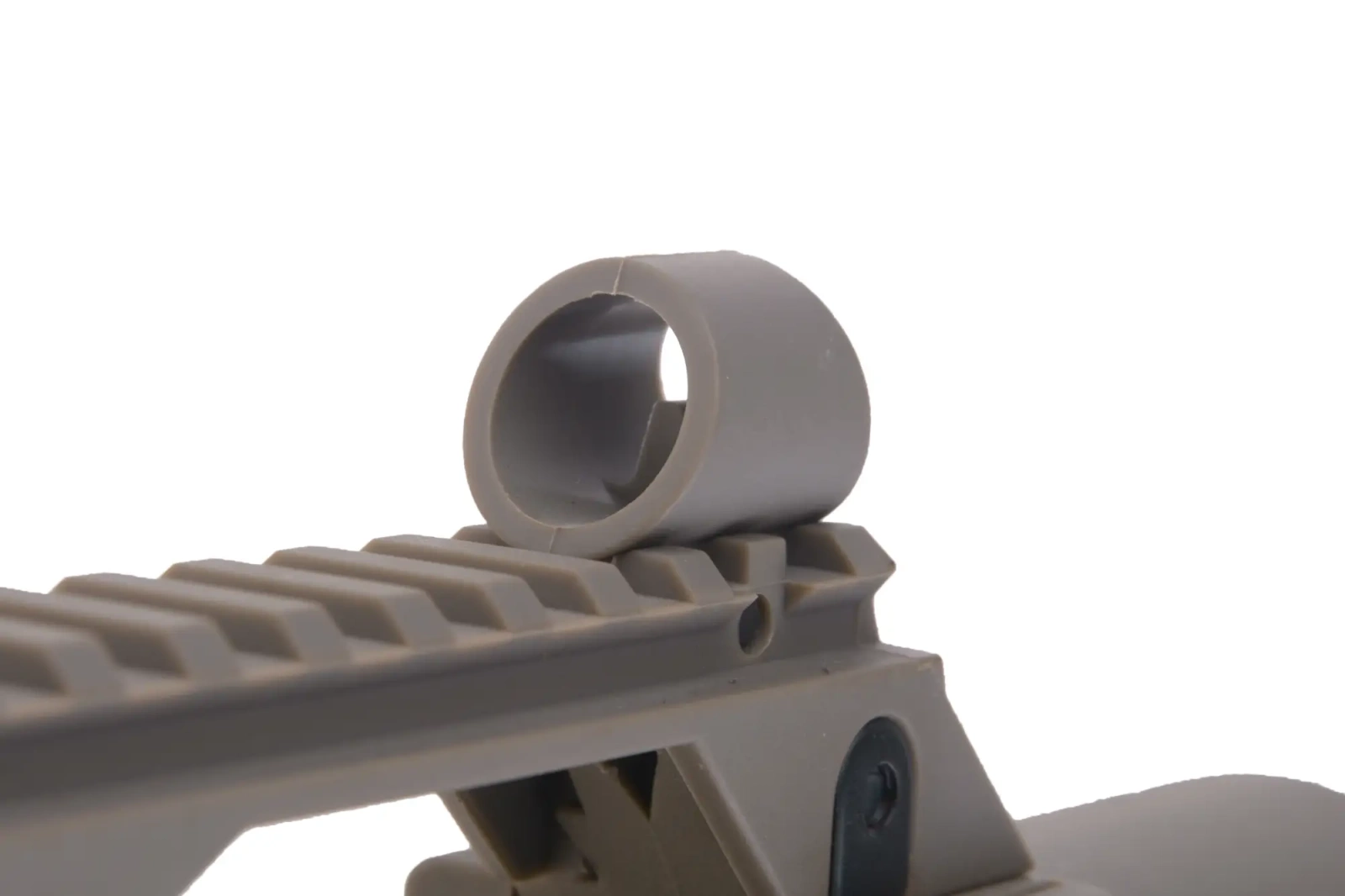 The replica is characterised by very good fit, made of an eye-pleasing matt polymer. Important components are connected by pins, in this way we can change individual elements such as the magazine slot. Made of solid polymer, the replica's body has a individual serial number, manufacturer's markings and aesthetic fire selector markings. On the back of the replica, in addition to the classic transport grip, we find a telescope with a fixed magnification of 1.5x. The replica has a side-folding adjustable buttstock, which facilitates transport as well as operation in cramped quarters of buildings. The replica's metal barrel is finished with a flame suppressor mounted on a 14mm CW thread.