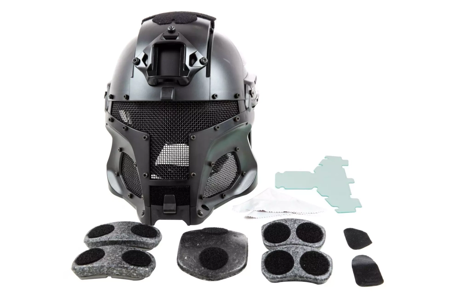 The helmet’s uniqueness, however, takes the form of a modular mask - visor, which if needed can be easily raised. All that is necessary is to press a button located near the chin - the spring-operated visor will be lifted along the guides. The bottom part, protecting the lower part of the face, can be lowered. Key parts that protect the face had been made of a steel mesh covered with an anti-corrosive laminate. It was possible to provide excellent air permeability. The set also includes an exchangeable glass. In addition, the rear part of the neck is protected by a polymer panel attached with a hook and loop fastener.