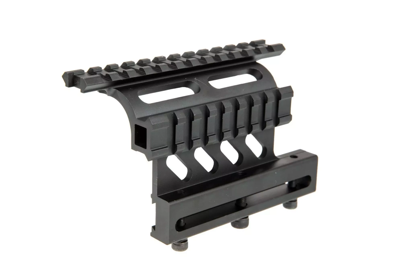 A mounting rail made of aluminum intended for AK carbines equipped with a “dovetail joint” side mounting rail. The top strip of Picatinny is 133 mm long and can feature a wide array of opto-electronic devices. The side rail is 95 mm long allows the user to attach other accessories.