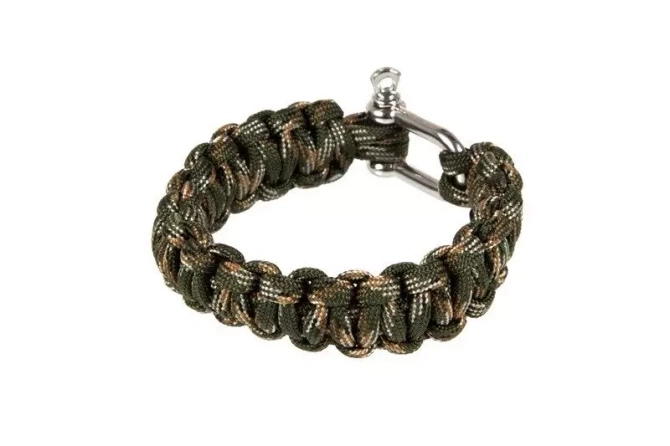 A bracelet made of braided paracord. It features a fastener in the form of a durable, metal shackle. Once the cord has been unrolled, it can be used to build a shelter, tools as well as for a number of other uses.