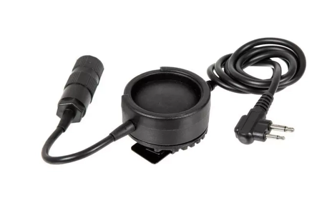 A PTT button for headsets equipped with a Military plug connector. The button is attached to equipment via a hook and loop fastener. It is made of reinforced nylon polymer, while the clip was made of steel.