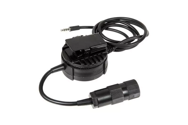 A PTT button for headsets equipped with a Military plug connector. The button is attached to equipment via a hook and loop fastener. It is made of reinforced nylon polymer, while the clip was made of steel.