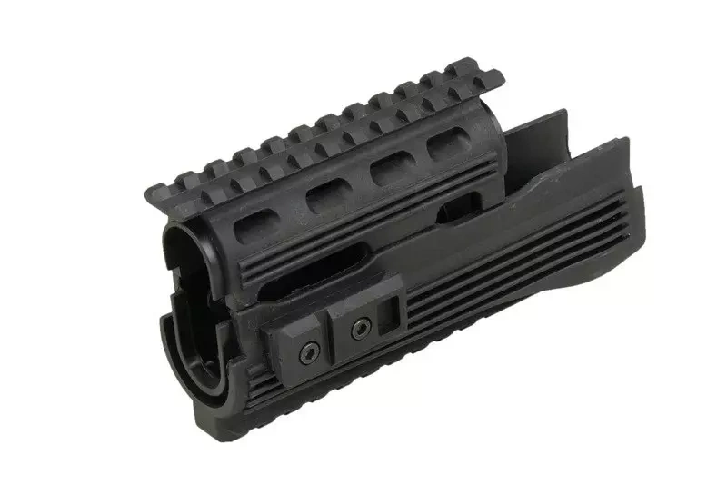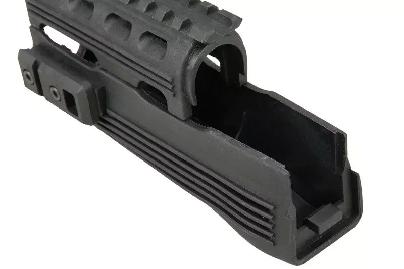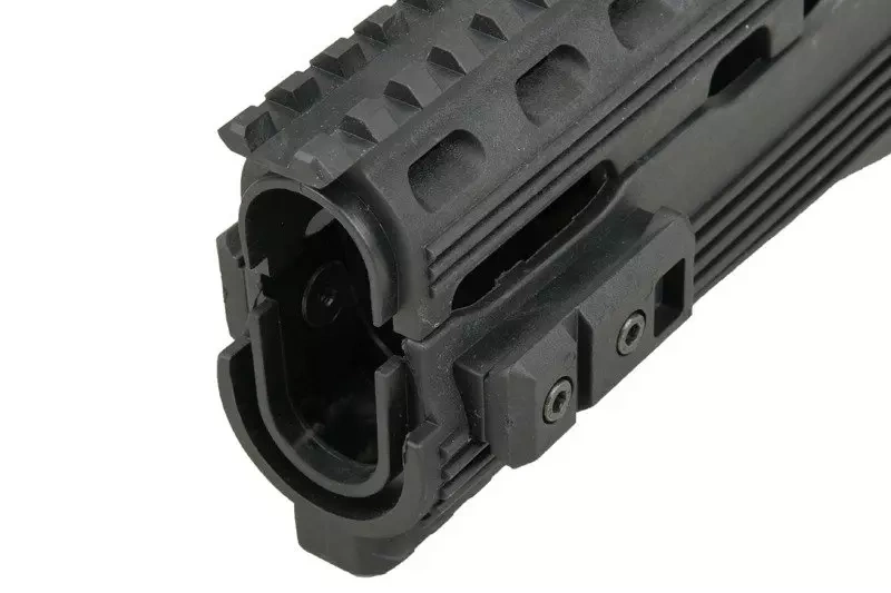 The made out of plastic conversion allows the classic AK replica to be equipped with a set of RIS rails and a comfortable, profiled pistol grip. The stock with the gas cylinder tube has 4 RIS rails combined. Two short ones, 45mm each and 120 and a 130mm long one.