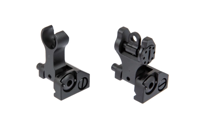 A set of flip-up iron sights by Specna Arms. Sights were made of durable metal and are intended for attachment to a RIS 22 mm rail. The front sight features up-down adjustment and the rear sight can be adjusted to the sides.