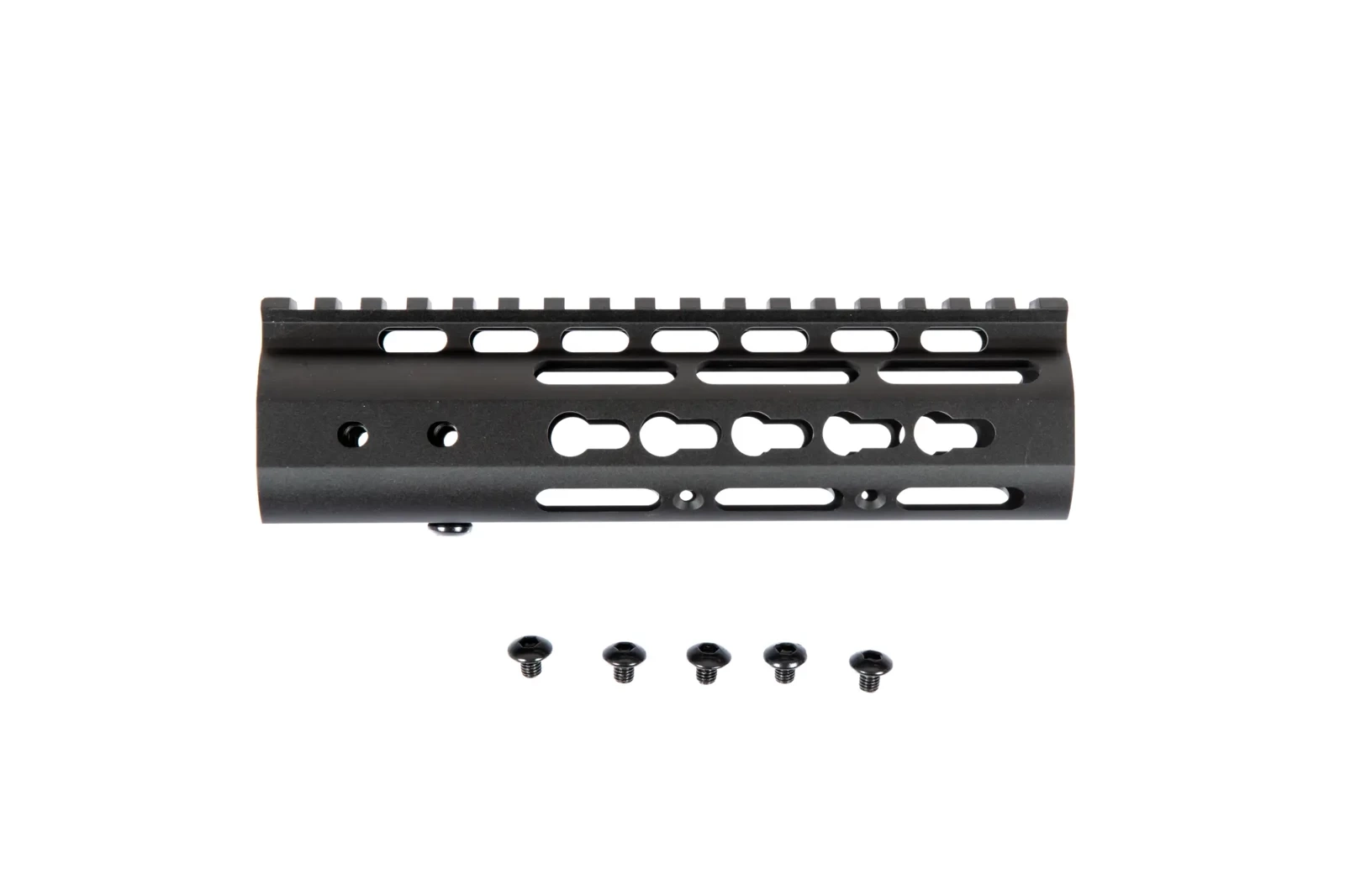 A RIS handguard featuring KeyMod 7" mounting system by Specna Arms. The handguard is 177 mm long and has been made of high-quality aluminum processed using precise CNC machines. The handguard is intended for the attachment in M4 / M16 replicas.