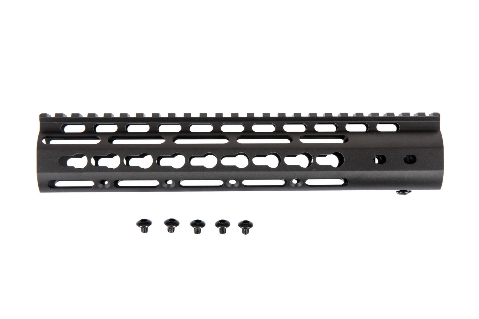 A RIS handguard featuring KeyMod 10" mounting system by Specna Arms. The handguard is 255 mm long and has been made of high-quality aluminum processed using precise CNC machines. The handguard is intended for the attachment in M4 / M16 replicas.