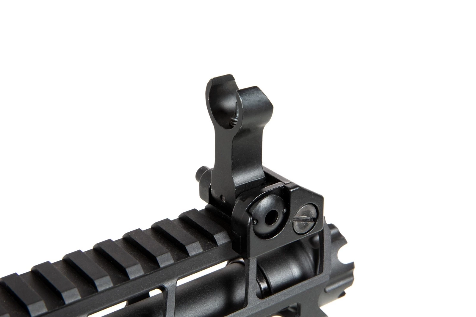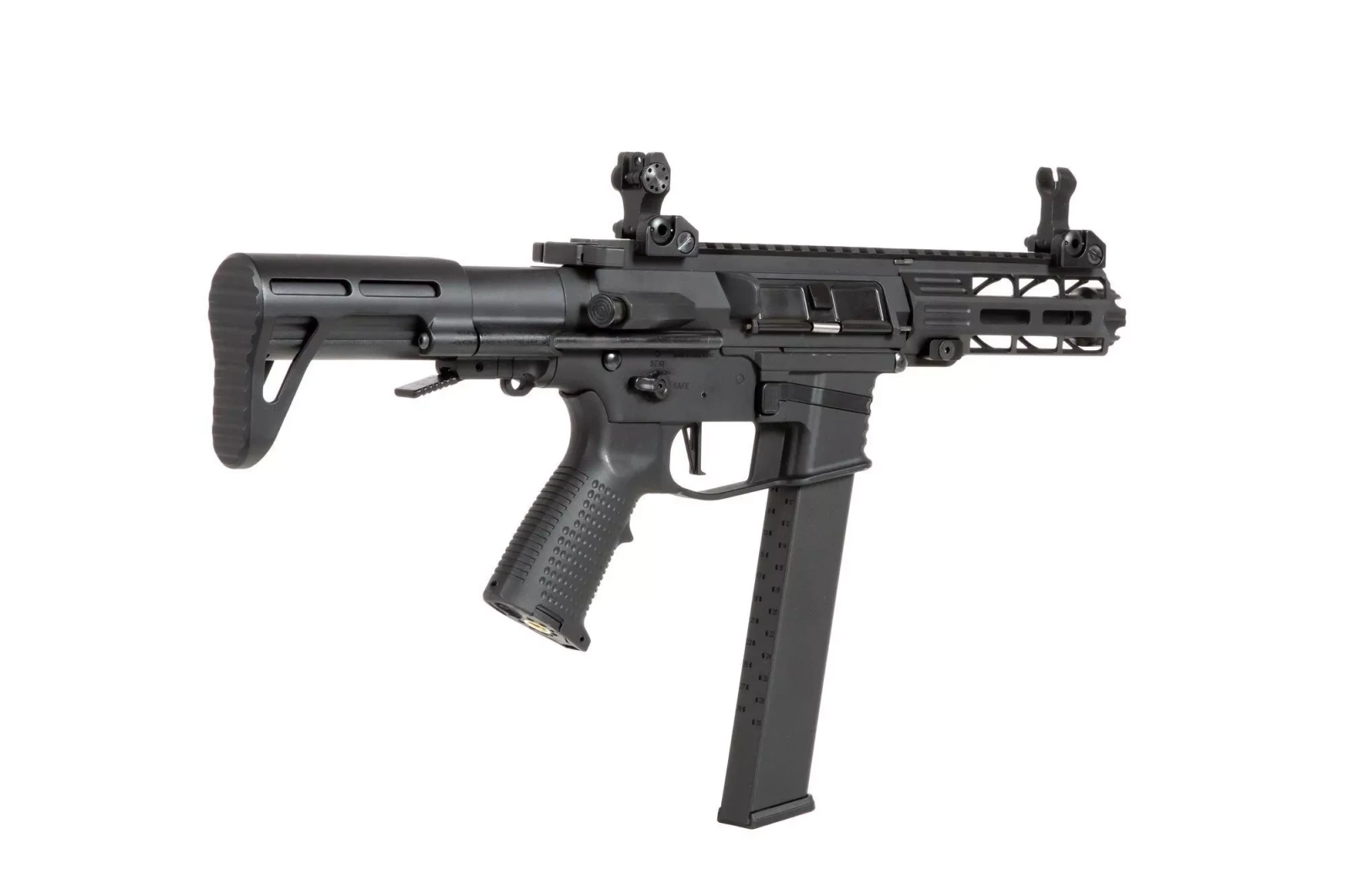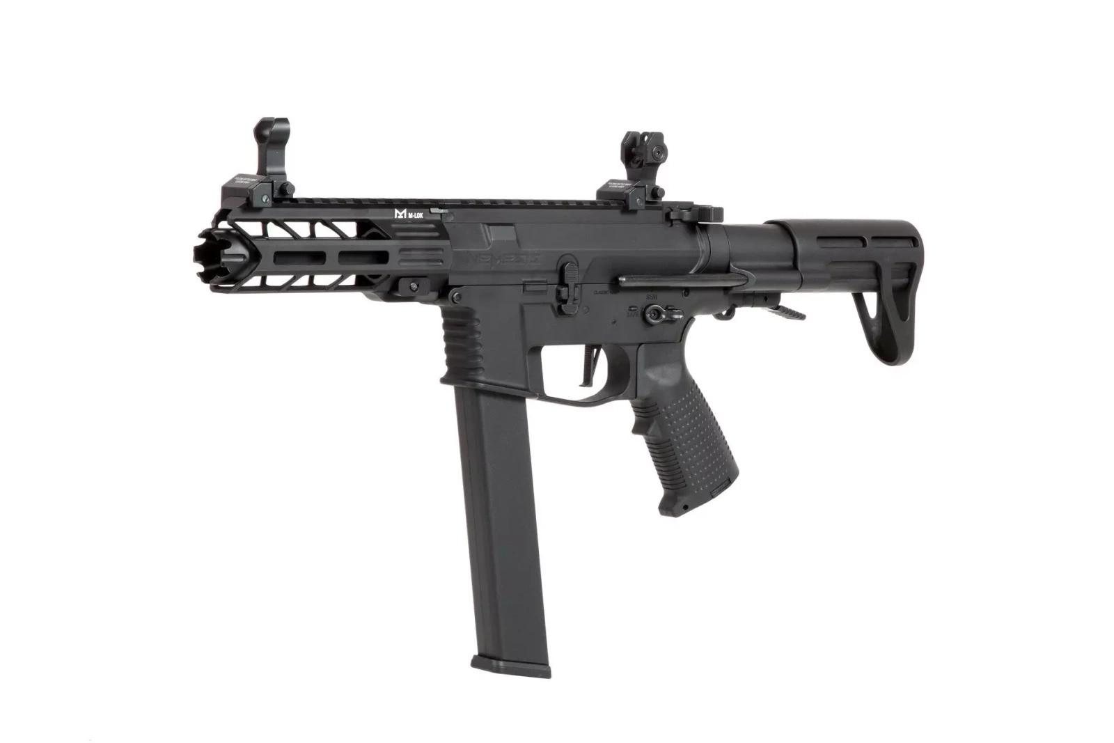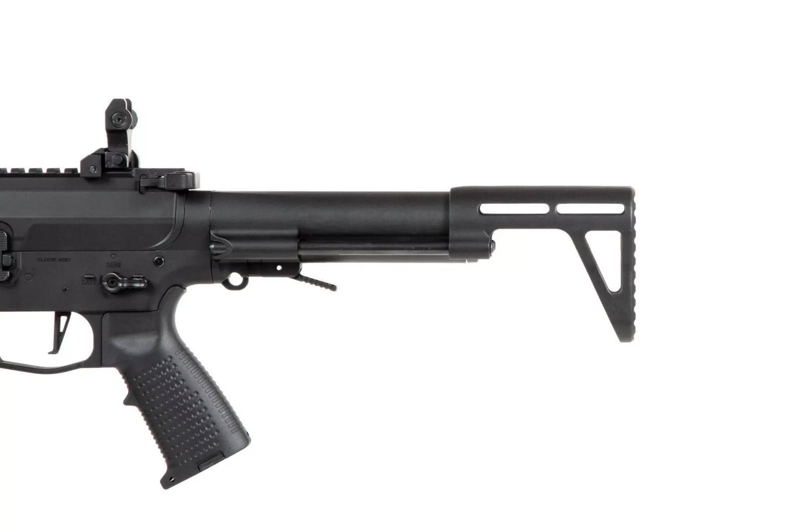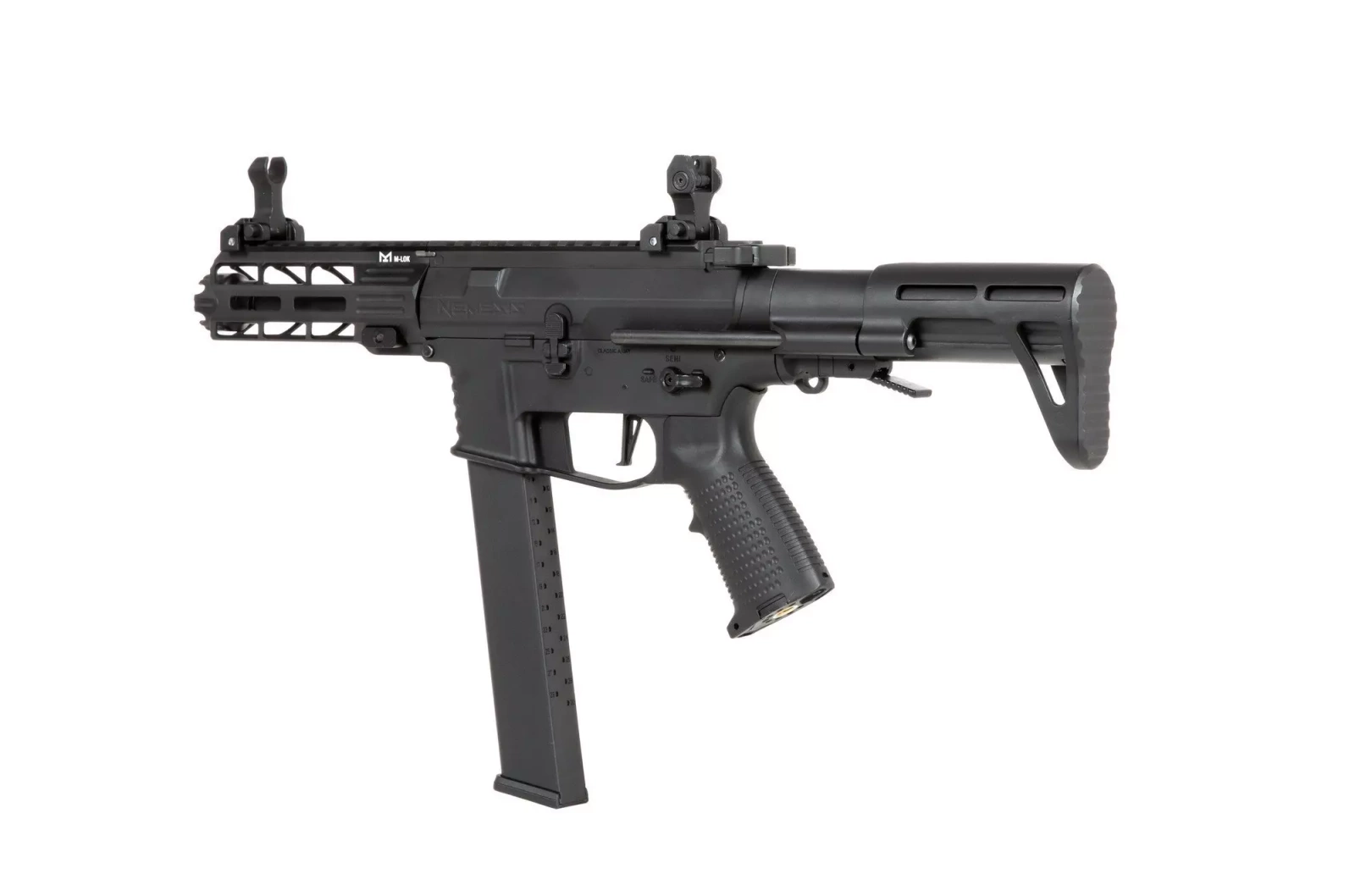 Nemesis series is characteristic for its replicas made entirely of metal with steel parts. The implementation of an ergonomic grip and double-sided manipulator buttons improve the comfort of use. The foldable, two-setting stock enables the adaptation of the length of the replica to a User and makes it a compact construction, ideal for CQB scenarios. The receiver bears manufacturer markings. The top RIS rail features flip-up iron sights.