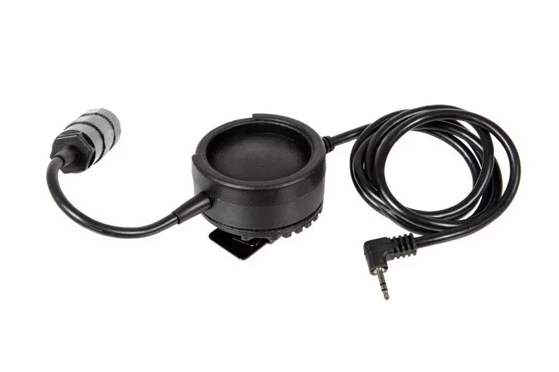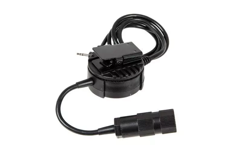 A PTT button for headsets equipped with a Military plug connector. The button is attached to equipment via a hook and loop fastener. It is made of reinforced nylon polymer, while the clip was made of steel.