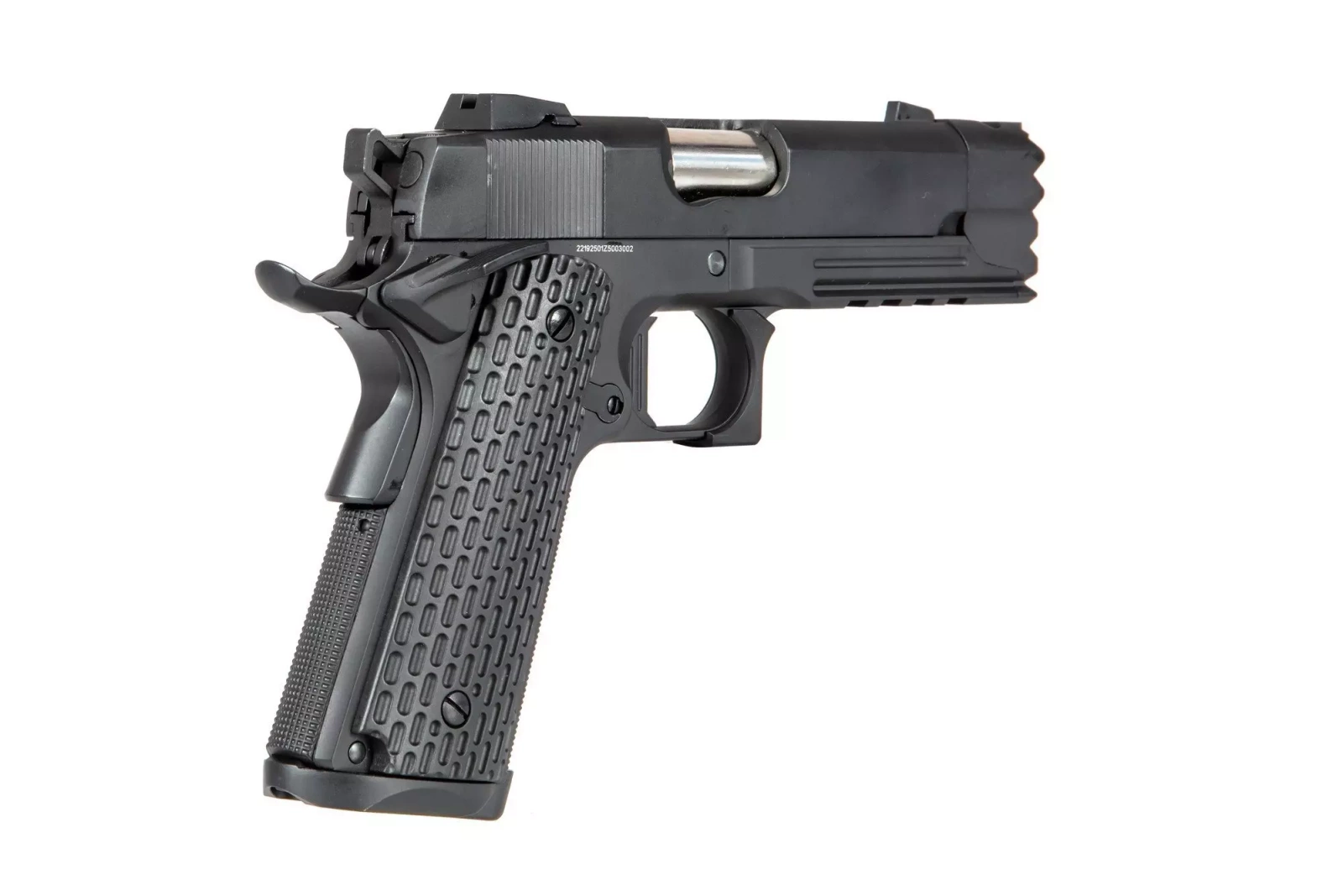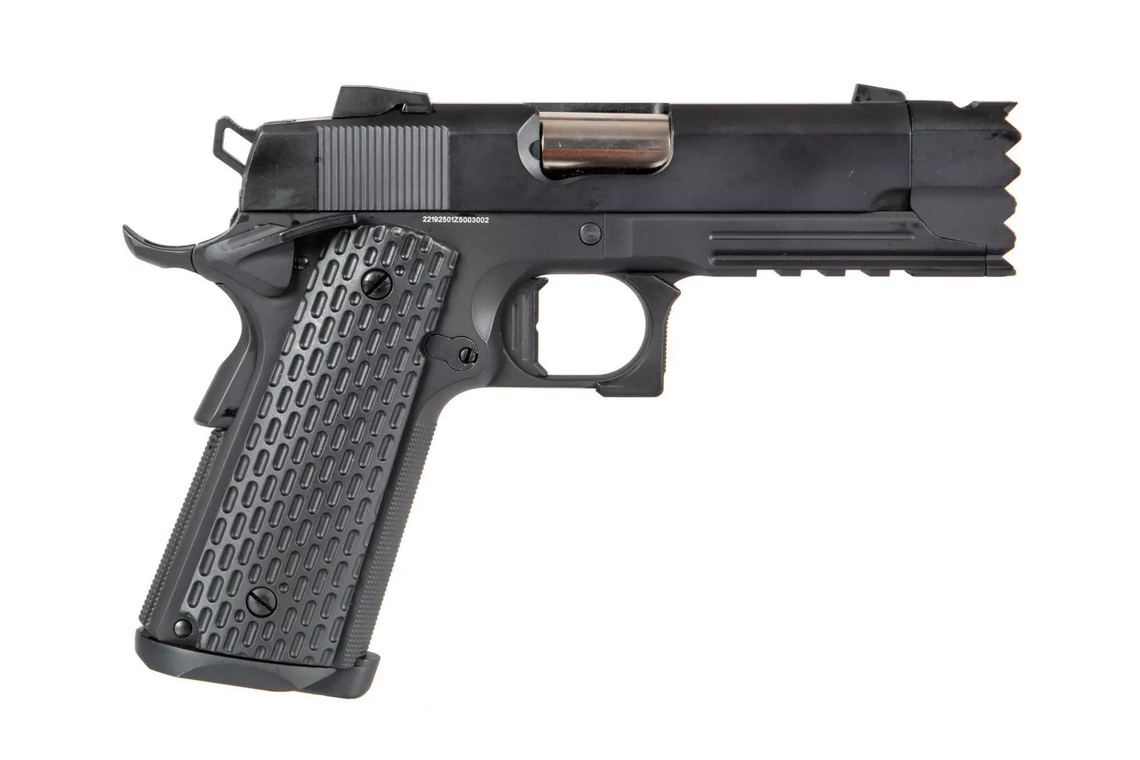 A pistol replica by Golden Eagle powered by Green Gas. The replica was made mainly of metal - elements such as the frame, slide, internal barrel and the magazine are made of metal. The only polymer part here are the pistol grip panels - just like in the live firearm original.