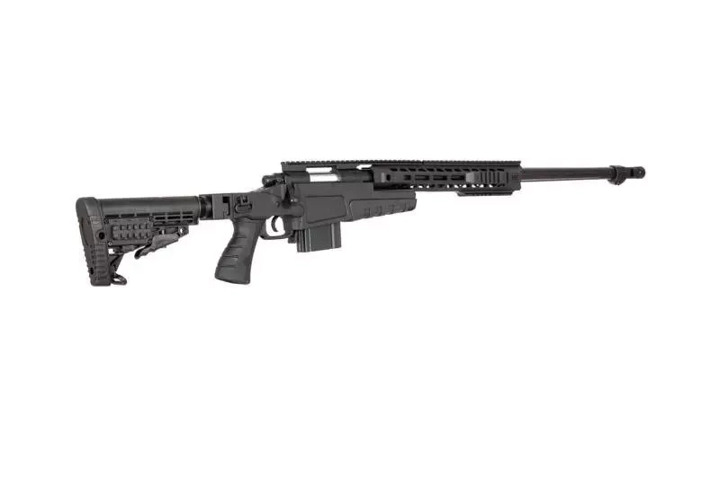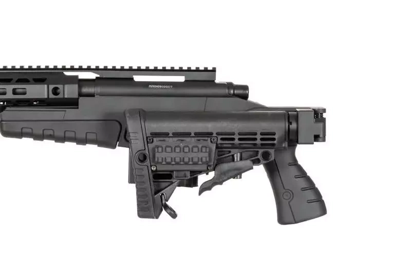 The replica is equipped with 4 RIS 22 mm universal mounting rails in total, which enables the attachment of a wide array of optical sights and additional accessories, for example, bipods. The structure of the replica consists of 3 main elements: RIS handguard, the trigger mechanism with the barrel and the stock with the pistol grip. The assembly of these elements into one lasts minutes and requires the use of several hex screws. Such a solution significantly simplifies the transport of the replica.