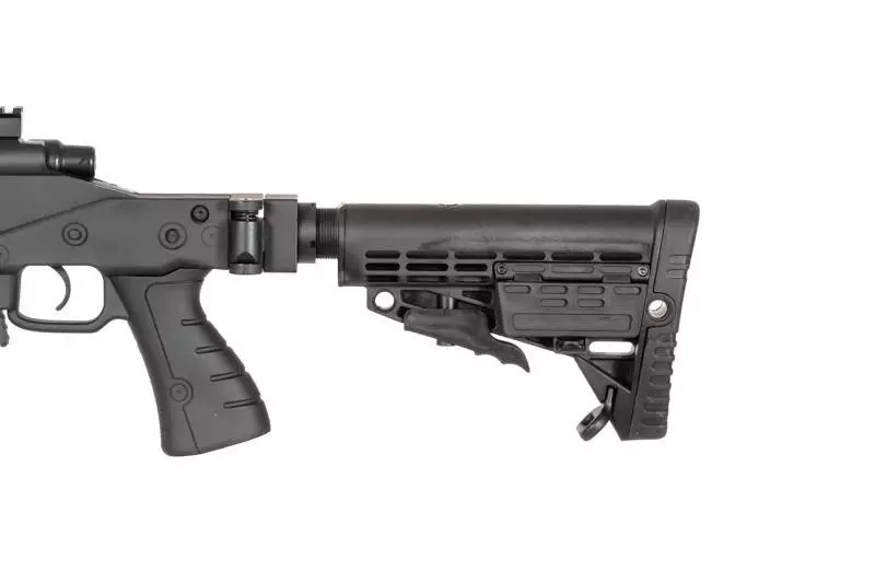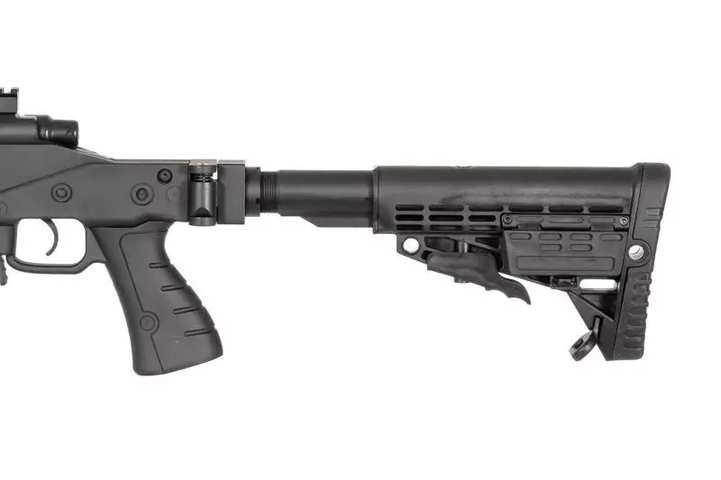 MB4419-1 spring-action sniper rifle replica by WELL. The internal construction is based on previous, well-known replicas from MB series. This is a bolt-action replica, which means that it needs to be reloaded every time prior to firing. The replica was made from metal and a nylon polymer reinforced with glass fibre. Metal parts include: a massive external barrel, the base of top RIS rail, all RIS rails, the stock tube, and ,of course, the internal mechanism with the trigger box and charging handle. Nylon parts include: forend, pistol grip, and the stock.