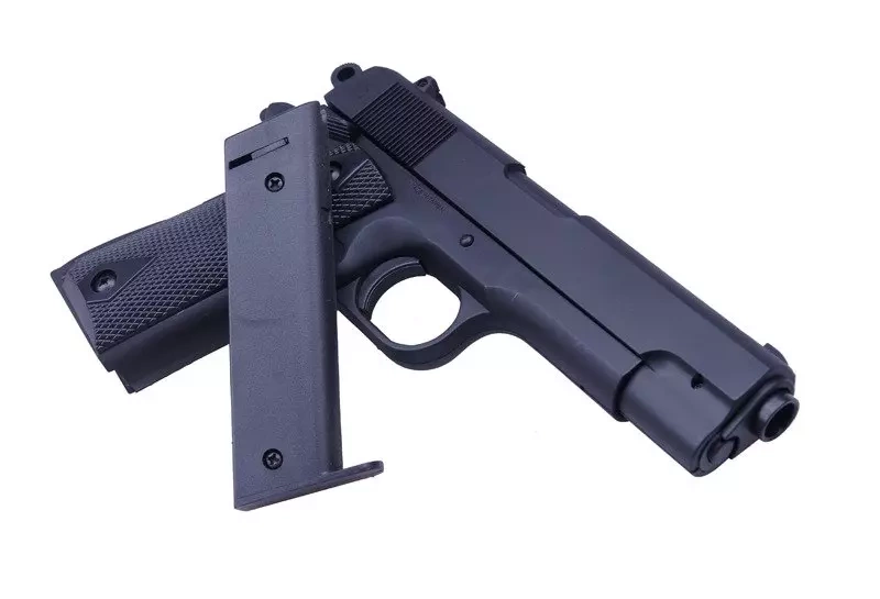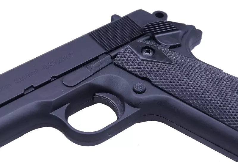 The pistol replica is made of durable plastic. The high attention to detail of make makes the replica  replicate visually the original firearm very well. The replica’s slide, just like in the original firearm, is equipped with special carvings which ensure a better grip while the reload process. The delicately operating and very sensitive trigger mechanism allows to place accurate shots.