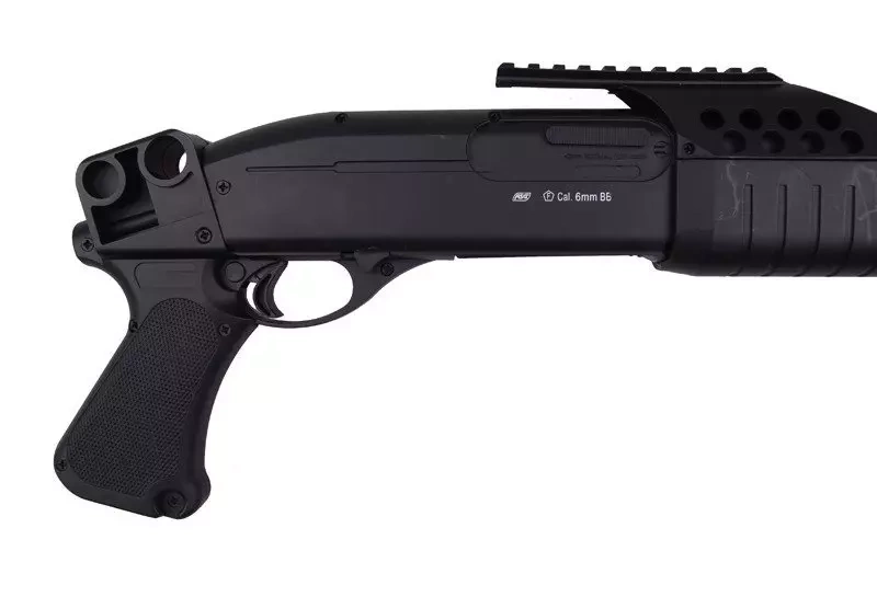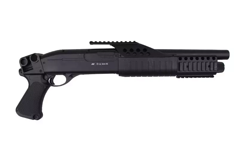 The spring-action version of this replica was made of durable plastic. The set includes four cartridges which are loaded with 6mm BB pellets. Thanks to the four RIS rails we can attach additional equipment on the replica, equipments such as: optical sights or tactical flashlights. The specially designed pouch thanks it put on the replica allows to carry the BB pellet loaded cartridges within the reach of the hand and makes it possible to load the replica quickly.