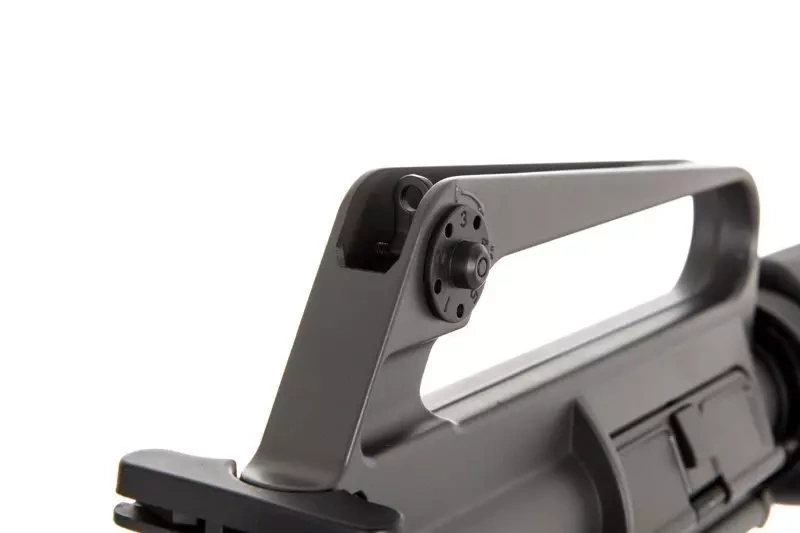 The carbine features an adjustable Hop-Up system that can be accessed by pulling back the charging handle, which opens the shell ejection window flap, revealing the adjustment knob.