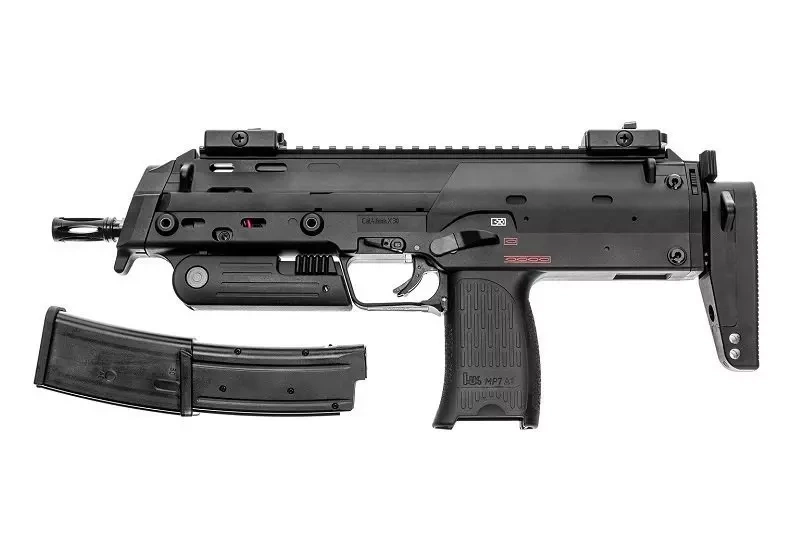 An electric Heckler&Koch MP7 A1 submachine gun replica made of polymer and metal. The receiver, vertical grip and magazine were made of polymer. The RIS rail, flip-up iron sights and internal elements were made of metal. Grip panels have anti-slip, rough texture. The replica bears licensed Heckler&Koch markings.