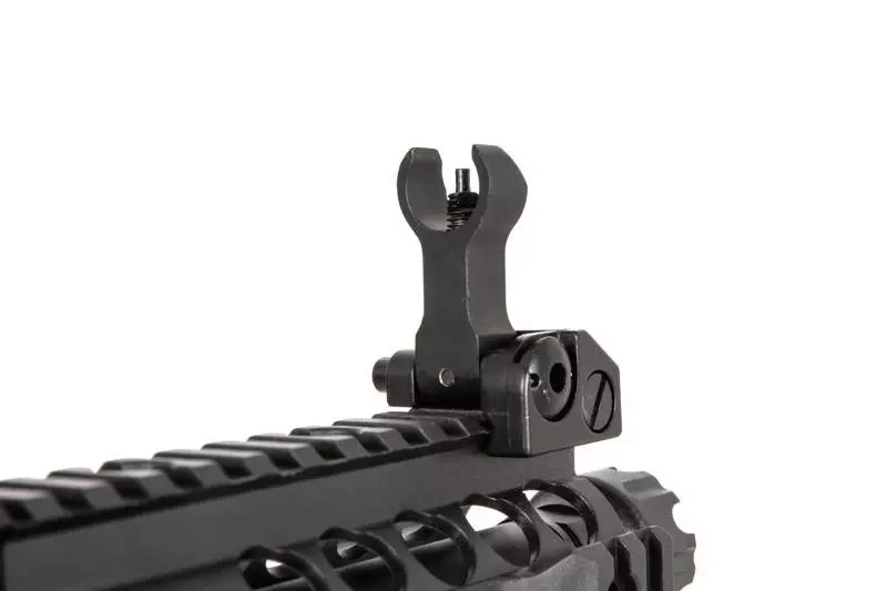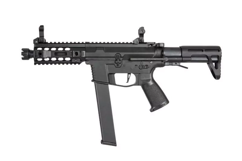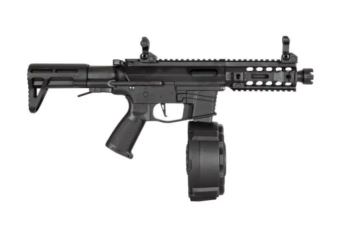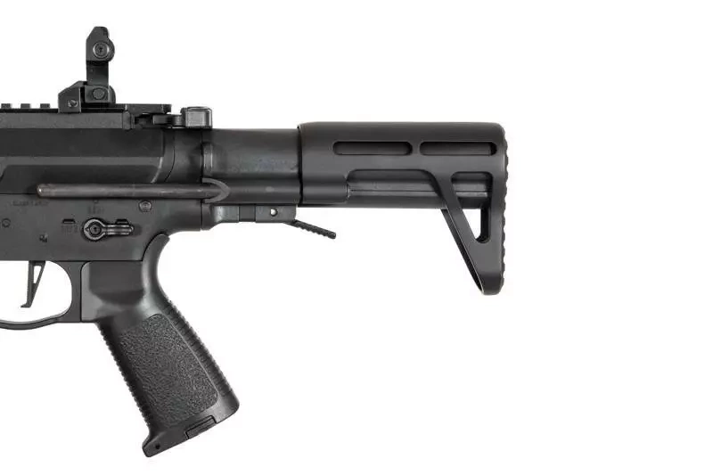 The PX9 series is characterised by replicas made of durable plastic, which will significantly reduce the weight of the replica. The use of an ergonomic grip and double-sided manipulators improves user comfort. A folding, two-position PDW-type buttstock allows the length of the replica to be adjusted to the user and makes it a compact design, ideal for CQB competition. Manufacturer's markings are applied to the body. On the dorsal RIS rail, folding sights are located.