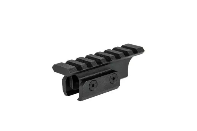 A light and durable mounting rail for AKS-74U replicas made entirely of aluminum using precise CNC machines. The rail is attachable in the place of a rear sight and allows for the attachment of RIS / Picatinny standard optical sights.