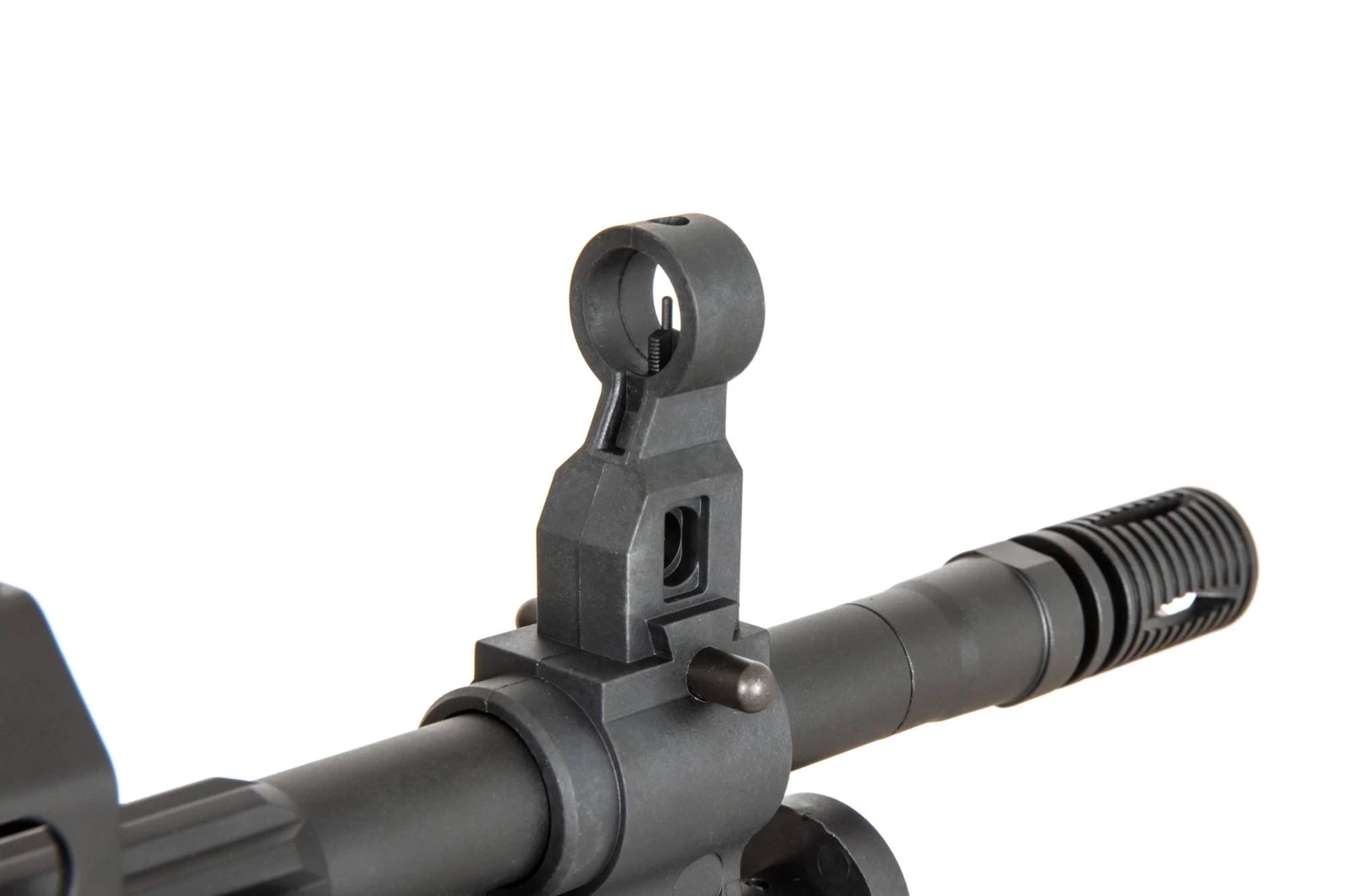 Metal parts include remaining elements such as the handguard with a set of RIS rails, the external barrel, magazine well, buffer tube, flash hider and the stock pad. Specna Arms light machine gun features several steel parts: a bipod, external barrel lock, stock support, trigger guard, transport handle as well as all pins and assembly elements.