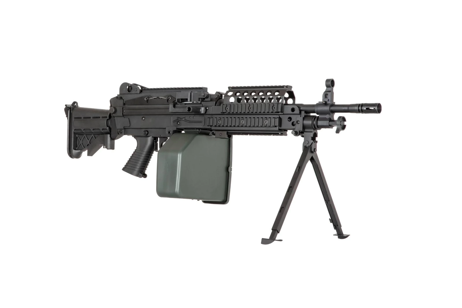 The replica is powered by a full-size, metal and heavy-duty M249 gearbox that is characteristic for its high durability and good reliability at stock. The mechanism is prepared for further tuning and ready for stress connected to providing covering fire. Inside, there are following components: