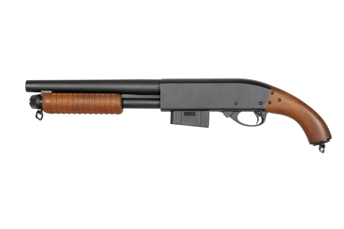 A spring-action, smooth-bore shotgun replica from SXR series made of metal and durable polymer. Apart from the polymer pistol grip and the fore-end, the replica was made of metal, which gives it appropriate weight, a little over 2 kg. Well-aligned together parts and materials used in the production process make SXR-004 give out a truly solid impression as soon as it is in one’s hands. It is an experience of holding a live firearm, not an airsoft replica.
