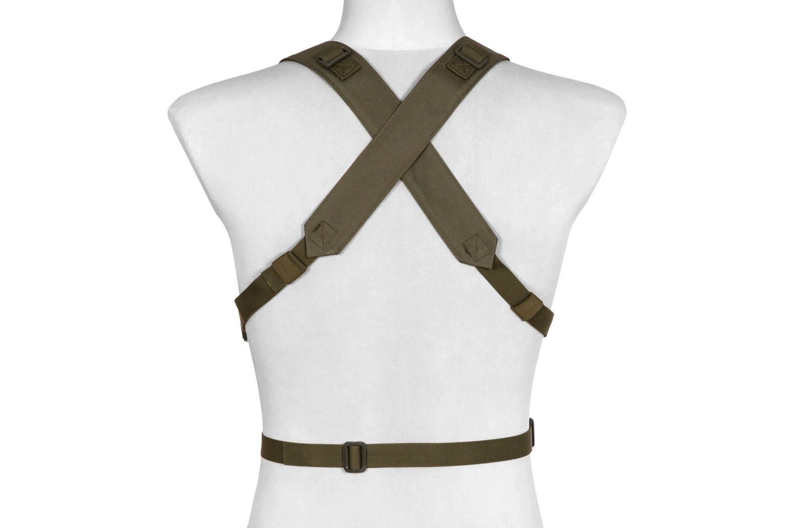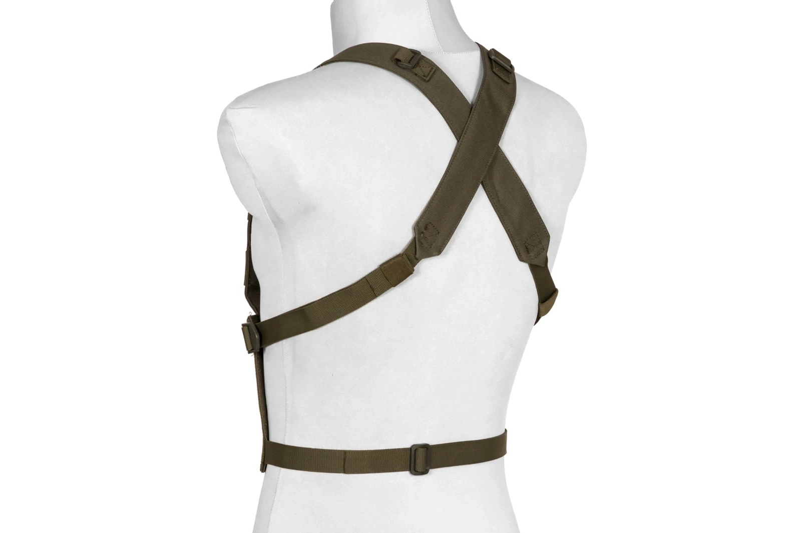 The chest rig’s carrying system is a comfortable "X" harness. The straps on the harness can be used to attach the hydration system tube, IR markers or chemical lights.