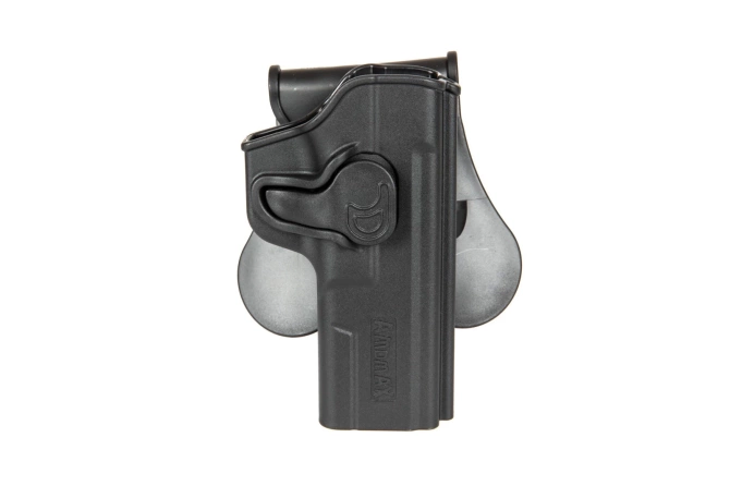 A pistol holster made of durable polymer by Amomax for replicas. It features an intuitive lock, released with an index finger when reaching for a gun.