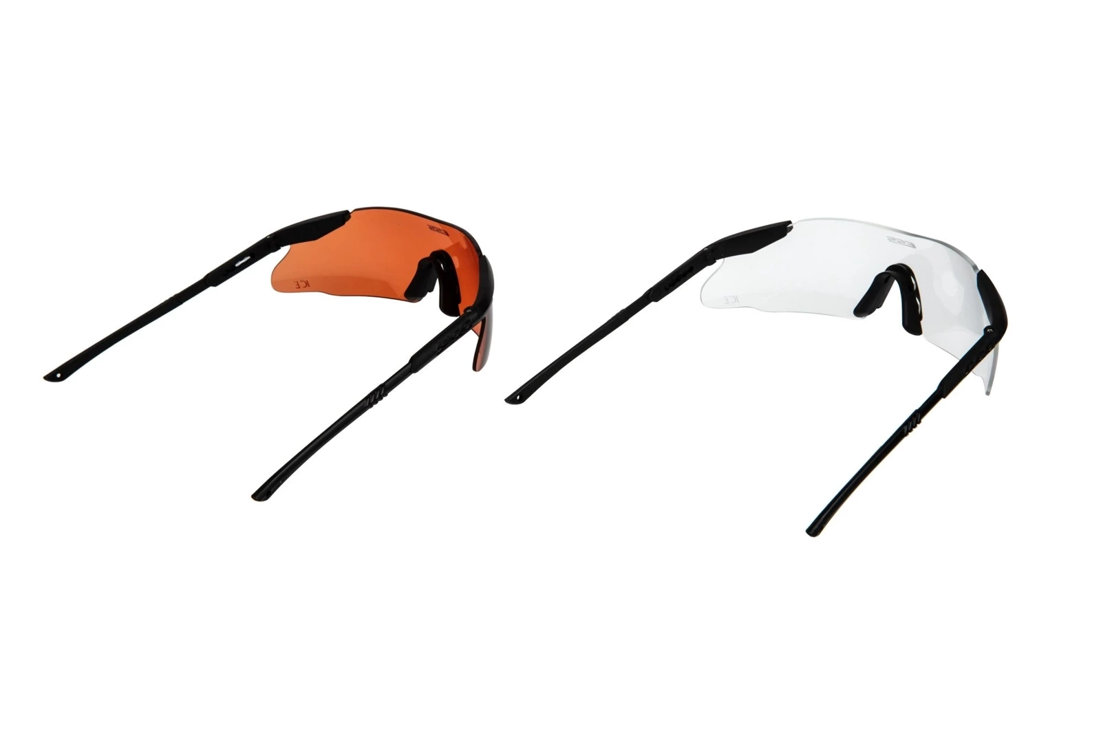 ICE ballistic glasses Tactical Kit   ICE glasses are a lightweight frame without frames. They perform the function of ballistic protection, covering not only the eyes but also their surroundings. An interesting option in the glasses are also adjustable temple lengths. The implementation of the ClearZone technology allowed for high resistance to scratching and evaporation.   In addition, the glasses have passed the UVA / UVB radiation tests as well as the MIL-PRF-31013 ballistic tests with the .15 caliber.   SPECIAL FEATURES: - The modular design makes it possible to replace any element of the glasses: the visor, temples or the nose piece - Resistant to damage and deformation ballistic visor of the first optical class with a thickness of 2.4 mm made of polycarbonate - The visor is distortion-free and guarantees a 100% protection against UVA and UVB radiation - ToughZone ™ technology that protects the visor from scratches - Unlimited field of view, perfect for weapon handling - Easy and very quick replacement of the visor which is mounted using profiled notches at the ends of the visor - Flexible temples with PosiLock ™ technology are adjustable in length, and they adapt perfectly  to the shape of the user's head - The temples guarantee maximum comfort and no pressure points - Comfortable, replaceable composite-silicone nose piece - Flexible strap securing glasses against loss - U-RX ™, P-2B ™ and Vice ™ correction inserts available   SPECIFICATION: - Visor material: polycarbonate - Visor thickness: 2.4 mm - Visors color:   • Transparent, visible light transmission: 90%   • Amber, visible light transmission: 32%   • Tinted, visible light transmission: 15% - Temple color: black - Visor dimensions:   • Length: 147 mm   • Width at the widest point: 48.1 mm   • Width at the point where the nose piece is mounted: 19.5 mm   • Spacing of side mounting holes: 114.4/130.5 mm - Temple dimensions:   • Width at the hinge: 152 mm   • Temple thickness: 2.5-5 mm   NORMS: - in accordance with the American civil standard ANSI Z87.1 - 2015 - in accordance the American army standard MIL SPEC MIL-PRF-31013 (Clause 3.5.1.1) - CE quality mark, in accordance with the European standards EN 166: 2001, EN 170 and EN 172 - frames in accordance with the European standard CE EN 166 FT - transparent visor compliant with the European standard CE 2-2.1 FT K N - tinted visor compliant with the European standard CE 5-3.1 FT K N - in accordance with the US Federal OSHA   The whole set includes:   - ICE ™ temples - two sets - Transparent  Clear visor - Hi-Def amber amber visor - Smoke Gray tinted visor - A black microfiber bag for storing and cleaning glasses - Elastic neck strap - McNett Op Drops ™ Anti-Fog & Lens Cleaner - 7.5 ml - Solid, zippered rigid case with belt mount and composite clip