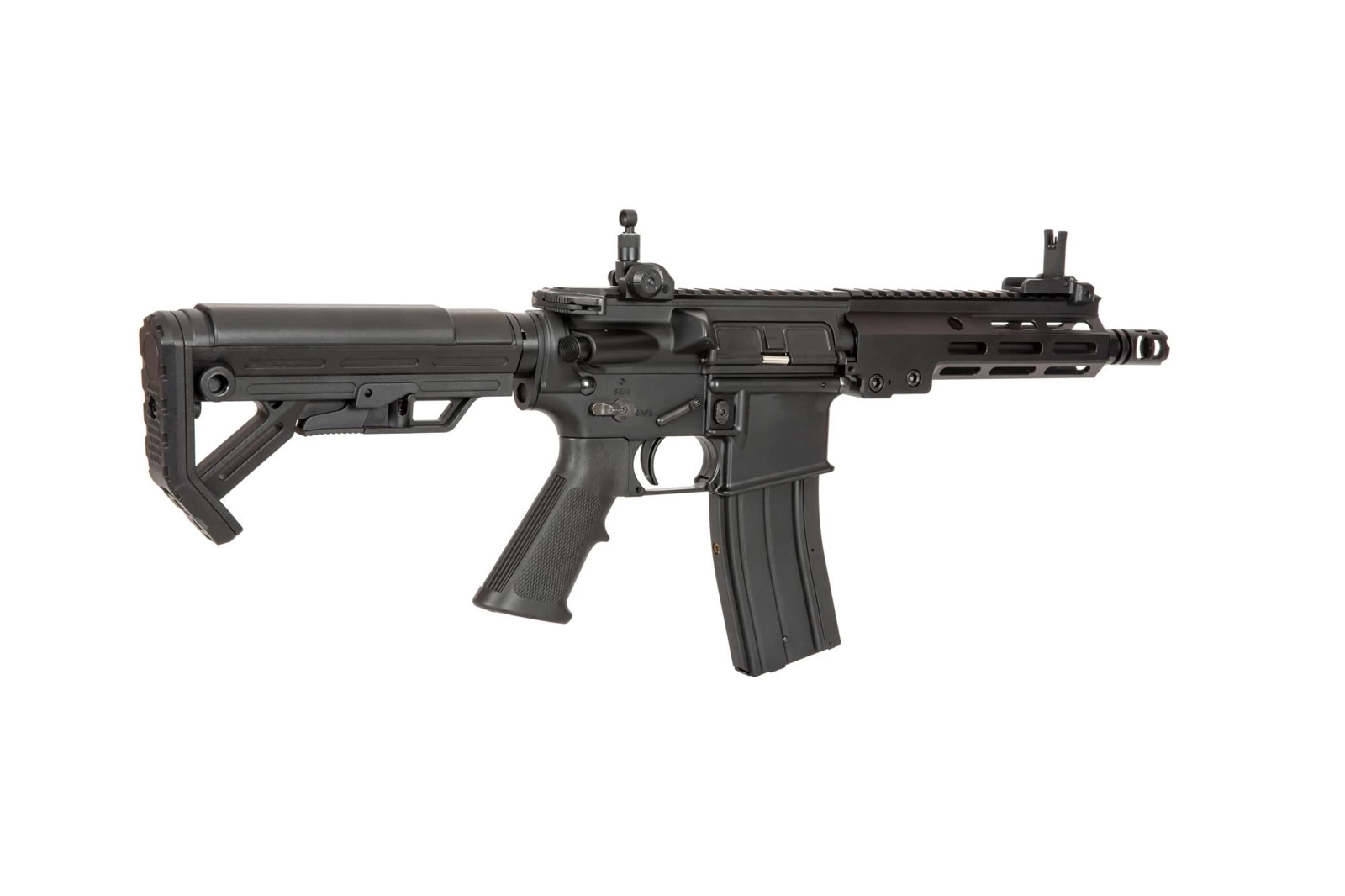 MC6594M carbine by Golden Eagle is an airsoft replica with powered by gas. The carbine is almost entirely made of metal, the only elements made of polymer include the pistol grip and telescopic stock. The receiver, the handguard, buffer tube and muzzle device are fully metal, while the shell ejection window flap is made of steel. The replica is aligned in a very solid way, there are no loose spots and thanks to full metal construction the carbine will prove itself even during most demanding of mil-sims and airsoft games.The implementation of an Open-Bolt air-sealed gas system, the replica offers excellent firing experience and the powerful Blow-Back recoil system adds realism. Just like in the live firearm original, after firing the last BB, the bolt carrier of the replica remains in rear position and after reloading, one must release the bolt-catch lock. Green Gas container is located inside the magazine.