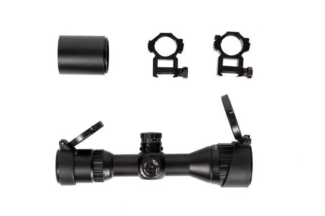 Made of high quality materials, this rifle scope has a variable magnification of 3-9x and an aperture of 32mm. With Mil-Dot crosshair illumination  (red or green), the scope can be successfully used for both day and night operations. The scope is powered by a CR1620 battery. The objective crosshairs are infinitely adjustable vertically and horizontally. The product is mounted on a standard RIS 22mm rail.
