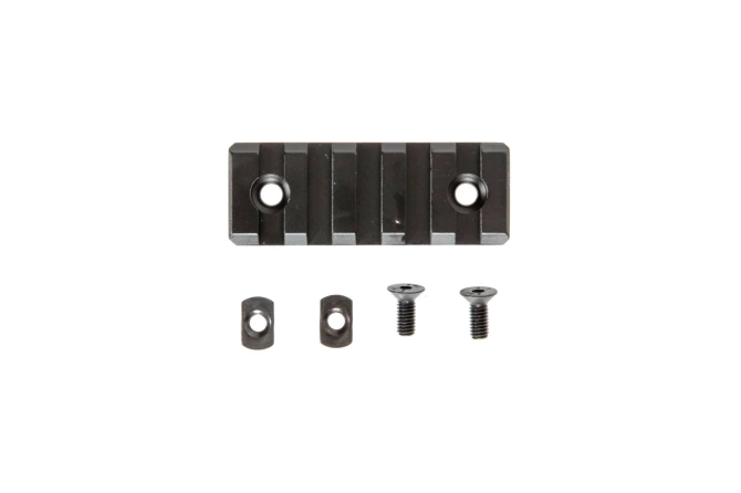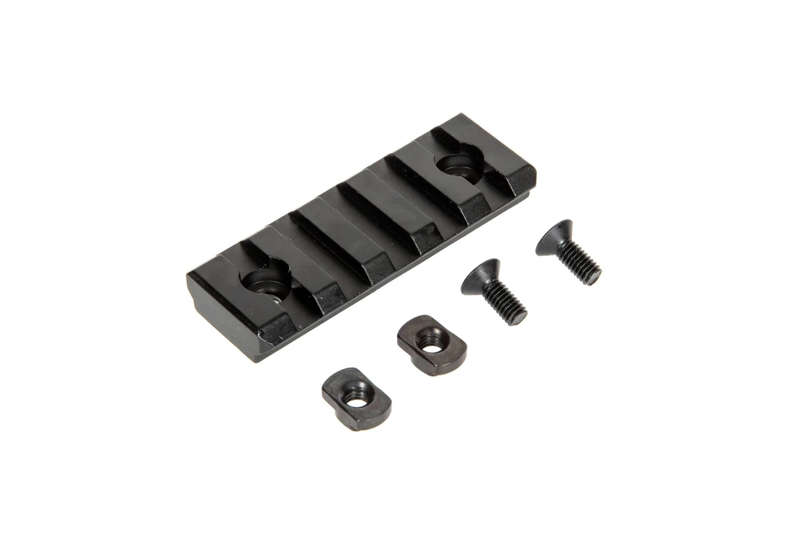 Mounted on a mlok system, the rail is made of aluminium. It has 5 slots