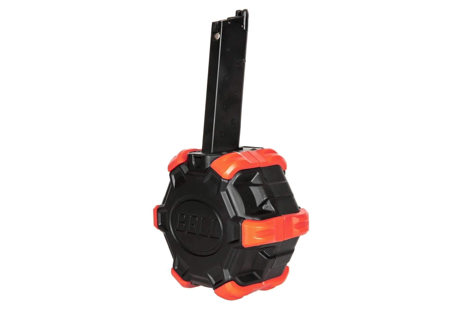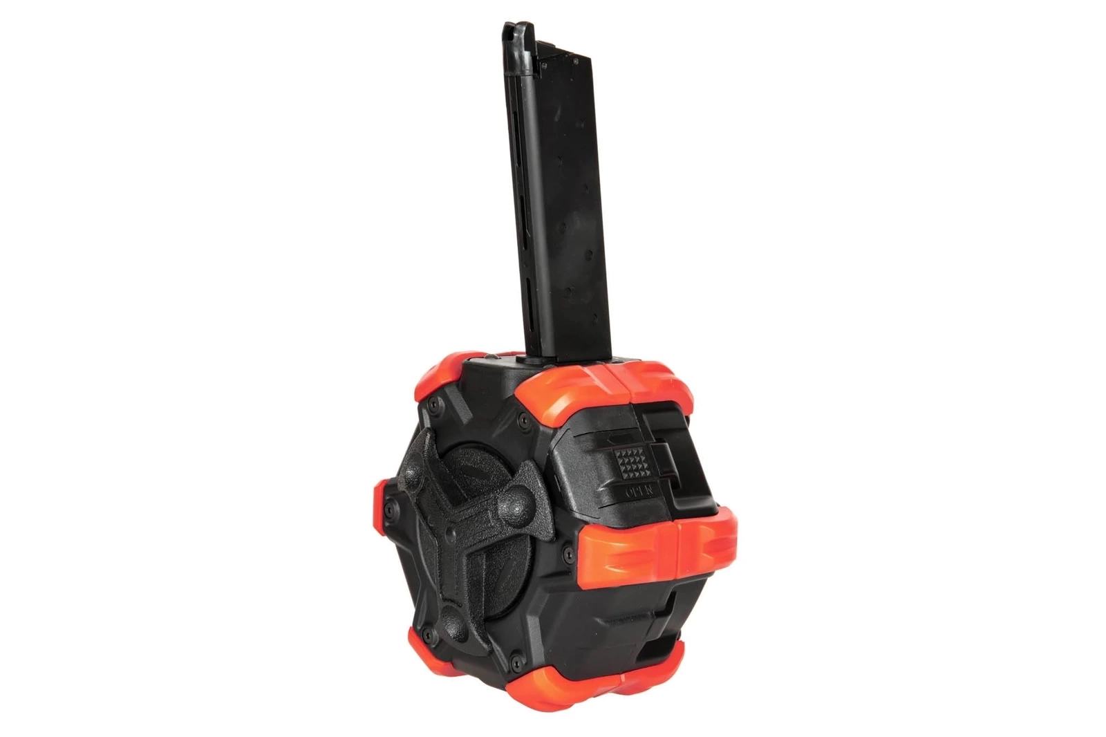 Wykonany z wytrzymałego tworzywa sztucznego oraz metalu magazynek bębnowy o pojemności 350 kulek. Magazynek gazowy pasuje do replik gazowych (Green-Gas) typu 1911. Wsyp kulek znajduje się z boku magazynka, z przodu zaś znajduje się mechanizm podkręcający kulki. Na dole magazynka znajduje się wlew gazu do dużego zbiornika.
