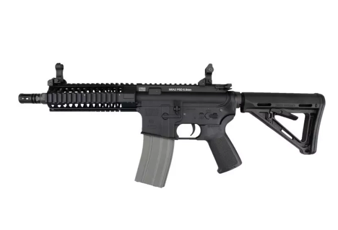 The replica is made of plastic and metal. The elements made of plastic are the stock and the Magpul pistol grip. The rest of the elements are made of metal. The stock is adjustable in five positions. The folded mechanical aiming sights are placed on a 22mm RIS rail Thanks to the CNC tooling the quality of the replica is very high. The set includes a Hi-Cap type magazine holding 300 BB pellets. The replica is equipped with an EBB system.