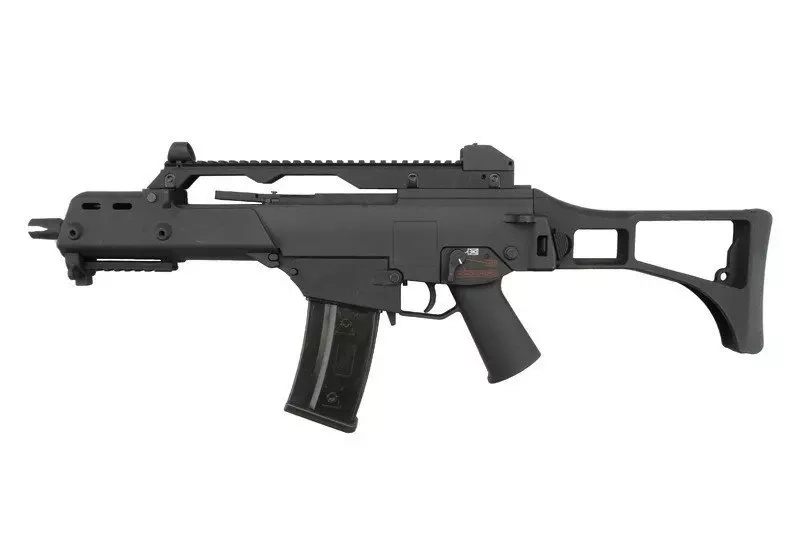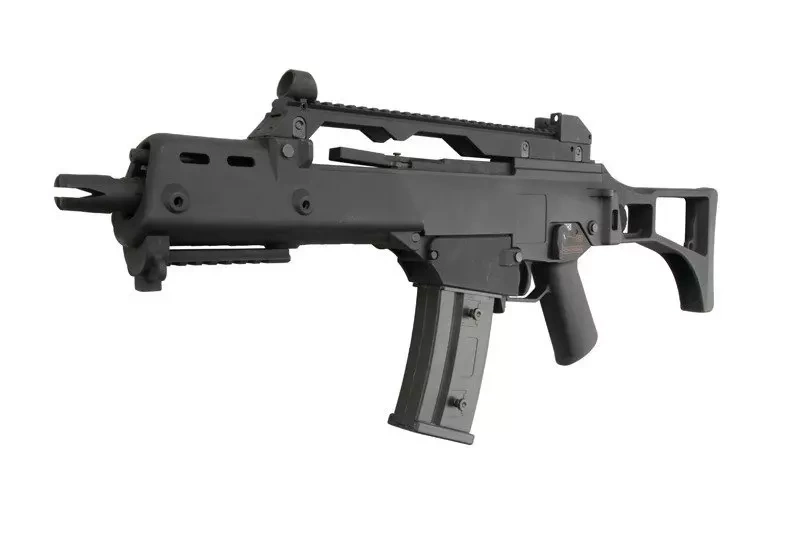 The carbine is equipped with a long 22mm RIS mounting rail on the upper grip, allowing the installation of various types of optical sights. There is also a rail under the front grip. The body material has a non-slip, rough texture, and a side-folding buttstock with a comfortable rubber footplate is used. The battery pack fits inside the front grip - it can be quickly removed by pulling out one mounting pin.