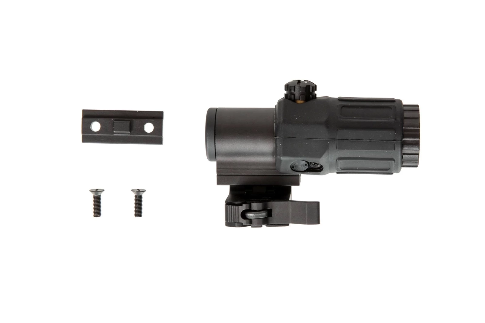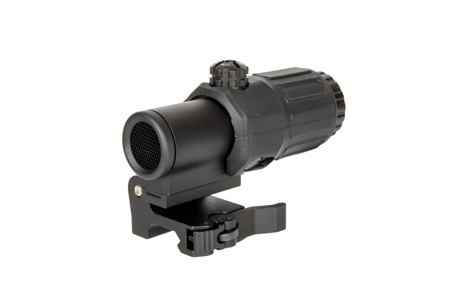 A magnifying addon by JJ Airsoft with a casing made entirely of metal, dedicated for cooperation with red dot sights. The scope has fixed 3x magnification and a quick QD mount for standard 22 mm RIS rail. Thanks to a latch mount (pivot) one can quickly tilt away the addon / switch to magnifying mode due to dynamically changing conditions on the playing field.