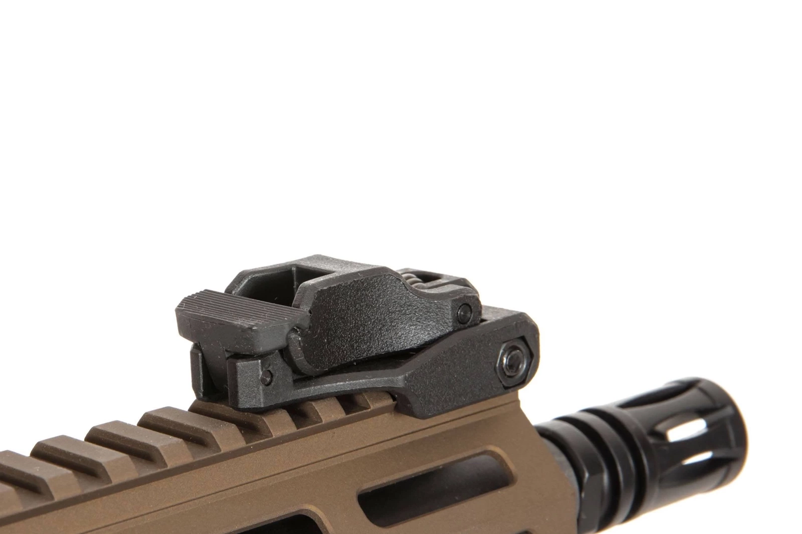 The replica is equipped with a M-LOK handguard and an adjustable stock. The top RIS rail features a flip-up rear sight that does not collide with optoelectronic aiming devices. Due to the extendable stock with an anti-slip stock pad, it is possible to adapt the replica’s length to the body type and preferences of the User. A standard flash hider is based on a 14 mm left-handed thread, which allows the attachment of a silencer in its place.