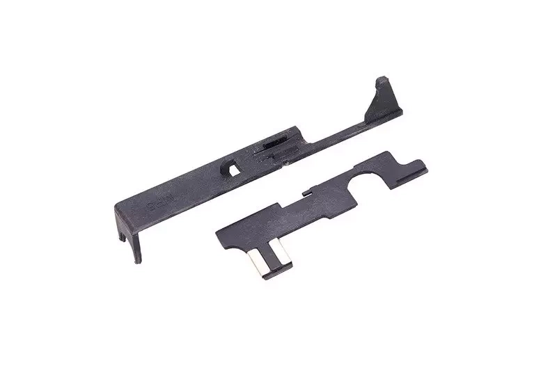 Płytka selektora z listwą popychacza przeznaczone do gearboxa V2. Gearbox V2 zawierają repliki broni typu M4, M16, MP5 lub G3.
