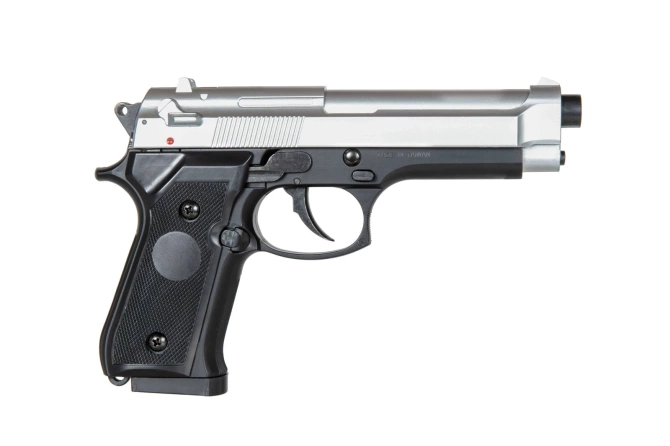 The replica is made mostly out of plastic. Only some of the internal parts are made out of metal. The replica has a locking system that locks the slide after the last shot, which makes the shooting feel more realistic. The magazine is made out of plastic and holds up to 24 BBs and its construction ensures convenient loading without the use of a speedloader.