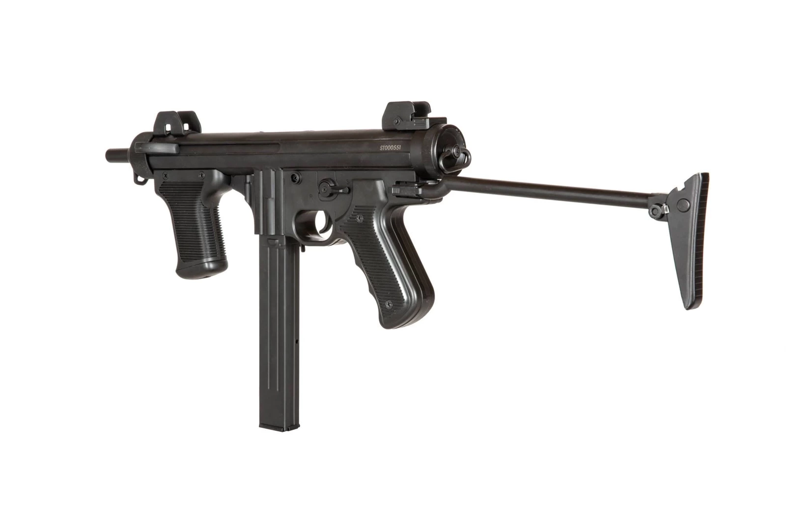 A replica of the Italian MP called PM-12-S2, made in Italy from in the 1960s. Used by Italy's special units: armed forces and police forces: special GIS and NOCS groups.
