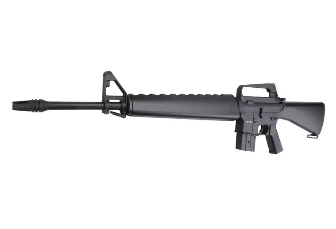 A replica of the assault rifle which during the Vietnam War was a standard issue weapon of the American troops. The replica was made of metal elements and of ABS plastic. The barrel guard, and the stock which holds the battery were made of plastic. The rest of the elements such as the receiver, outer barrel and the cocking handle were made of metal. The case of the short, often called as the Vietnam type, hi-cap type magazine (holding 190 BB pellets) is also made of metal.