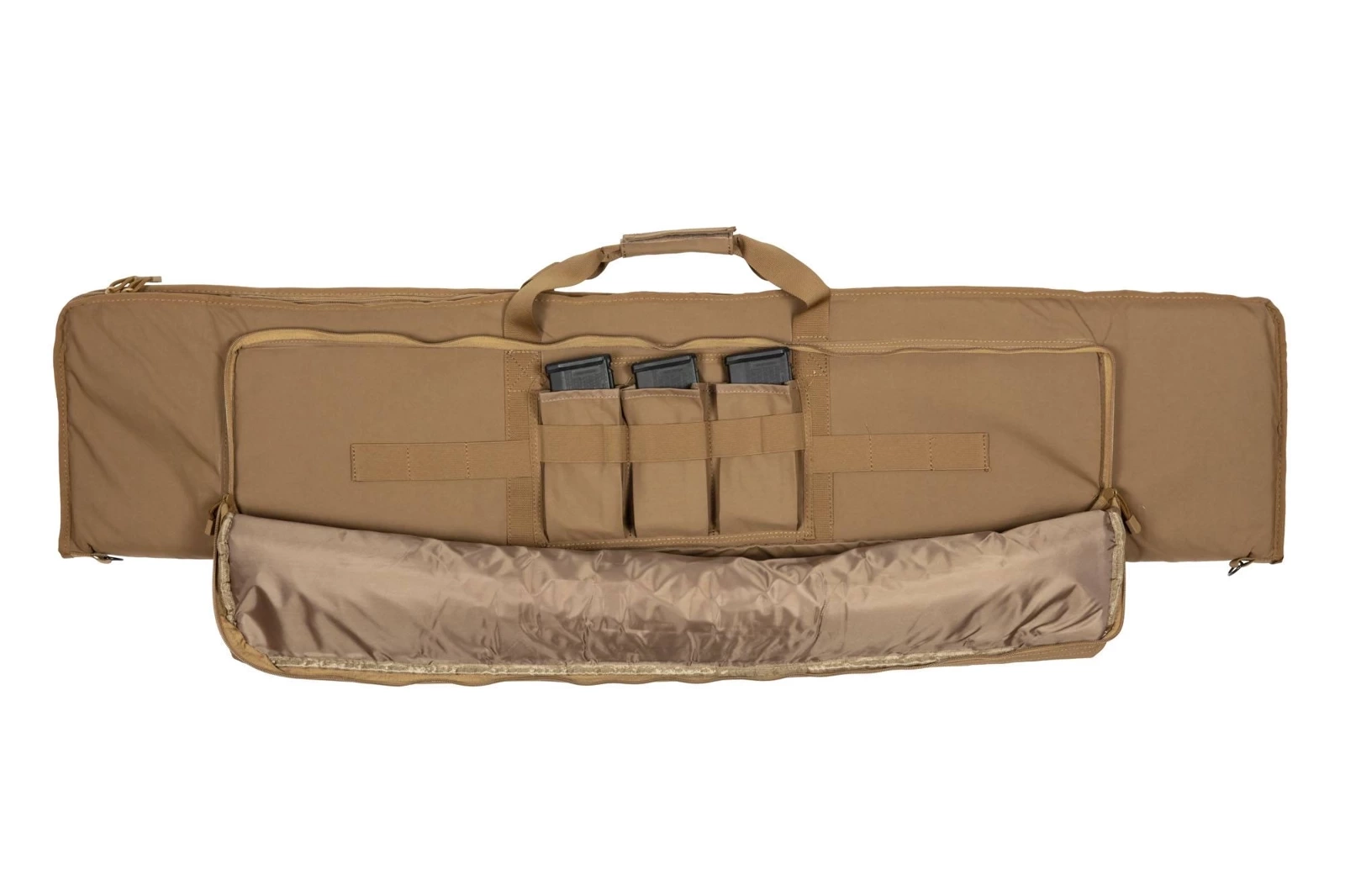 Inside the main compartment there are six stabilizing belts. The smaller compartment with dimensions of 900x220mm has three pouches for two magazines each and elastic belts that keep additional accessories in place. From the outside, it has been fitted with a MOLLE webbing that allow for the expansion of the gun bag with additional pockets and pouches. The accessories are secured with an internal soft sponge.