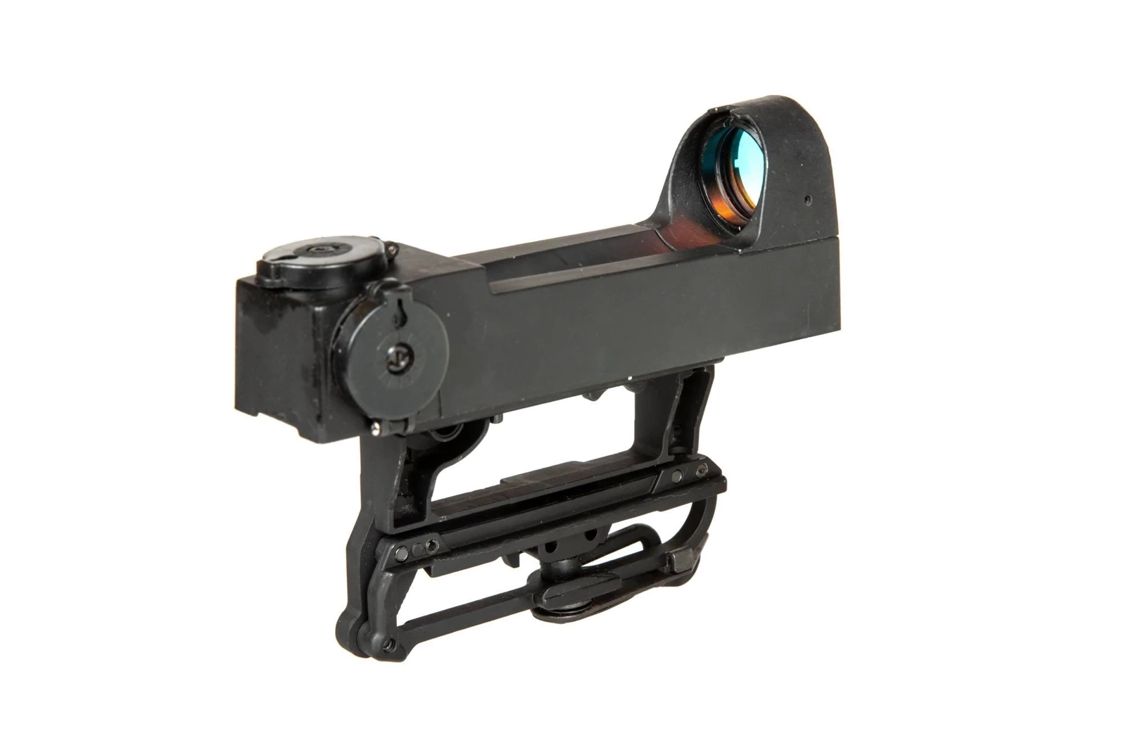 Replica of the Russian "Kobra" red dot sight. The red dot sight was made mostly out of metal. The battery compartment is located just above the mount, while the adjustment nut is on the front of the sight. The aiming point is a dot displayed in red. The red dot sight has the ability to change the intensity of the backlight and change the type of the aiming point (four types). Under the plastic covers there are knobs to adjust the aiming point vertically and horizontally. It is powered by two AA batteries (not included).