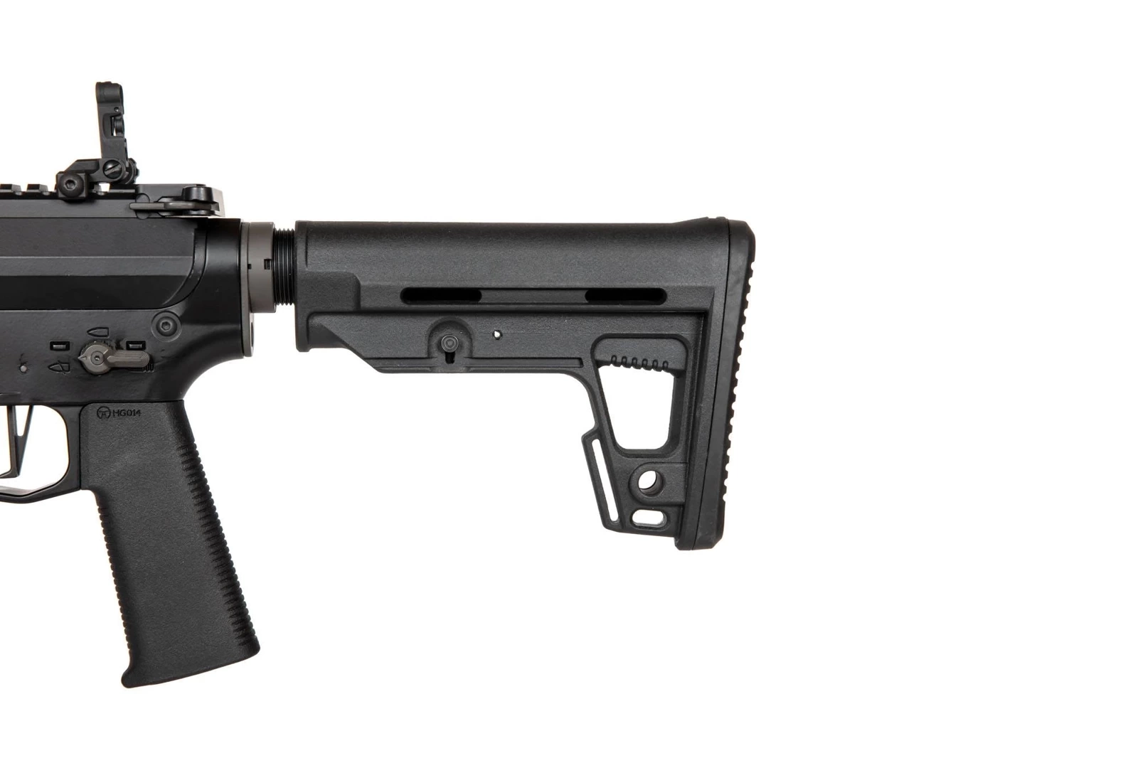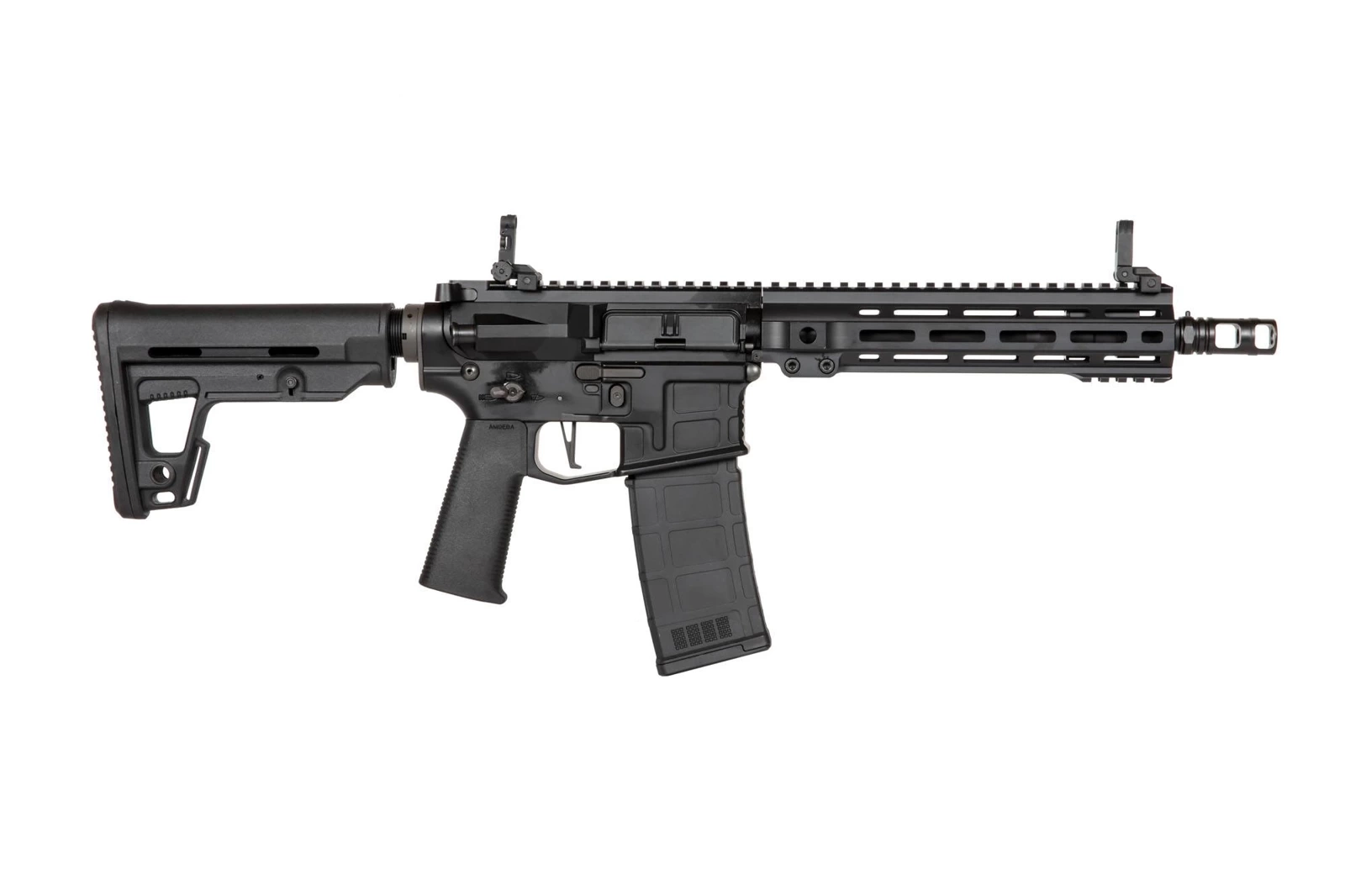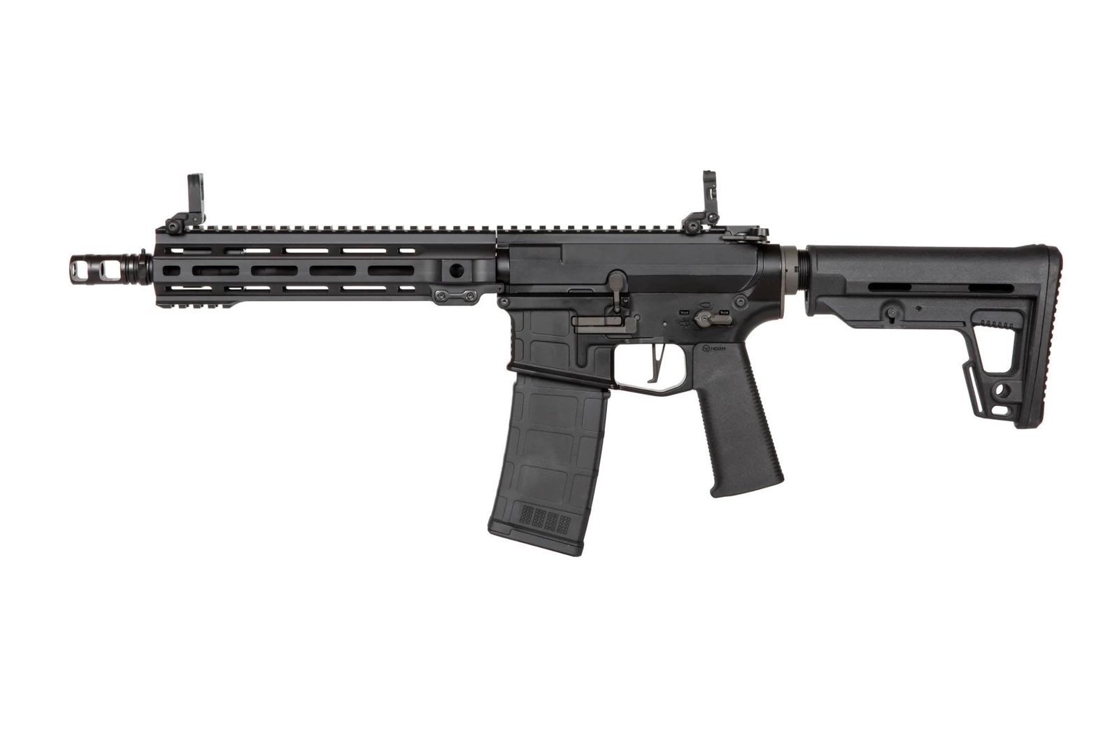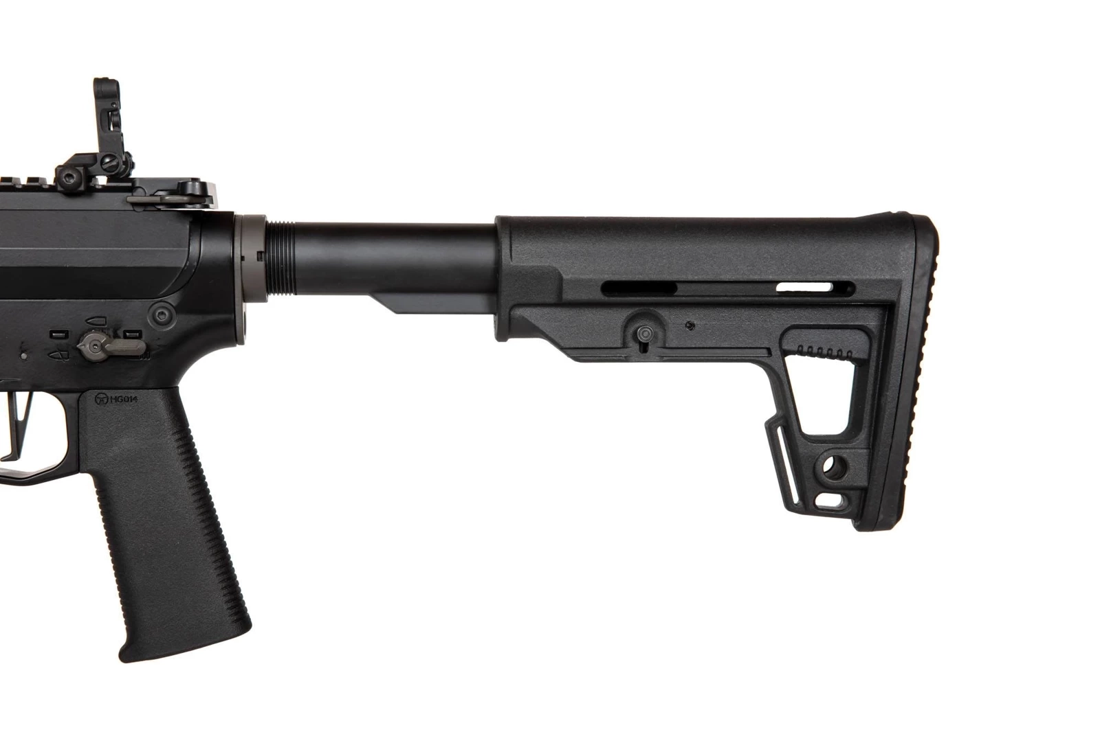 Model 9 from the X-Class series by Ares Airsoft, made entirely out of metal, apart from: The stock, pistol grip and magazine.