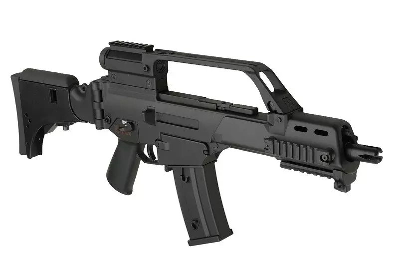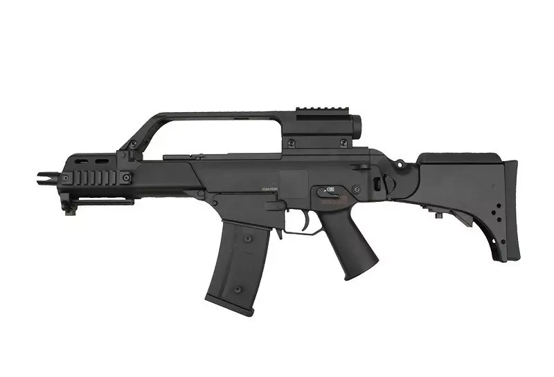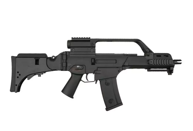 This replica is a continuation of the best replicas from this manufacturer - the JG608, which are already a legend in the airsoft environment. This version is equipped with an integrated barrel in the transport handle and a foldable to the side, full stock. In addition, on the top of the transport handle, on the level of a scope, is a RIS rail that allows for attachment of a reflex sight.